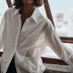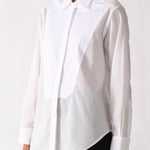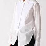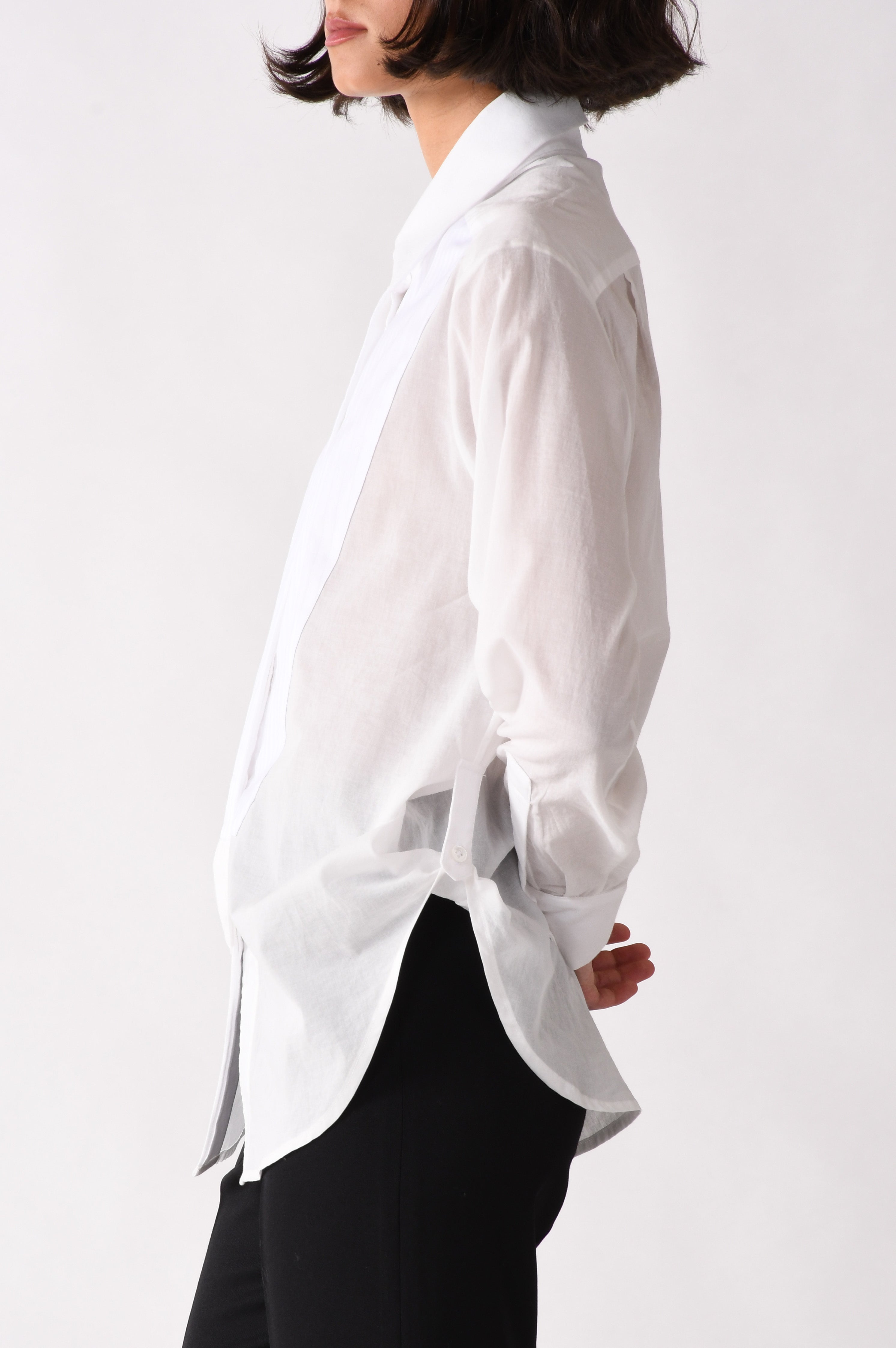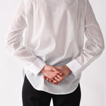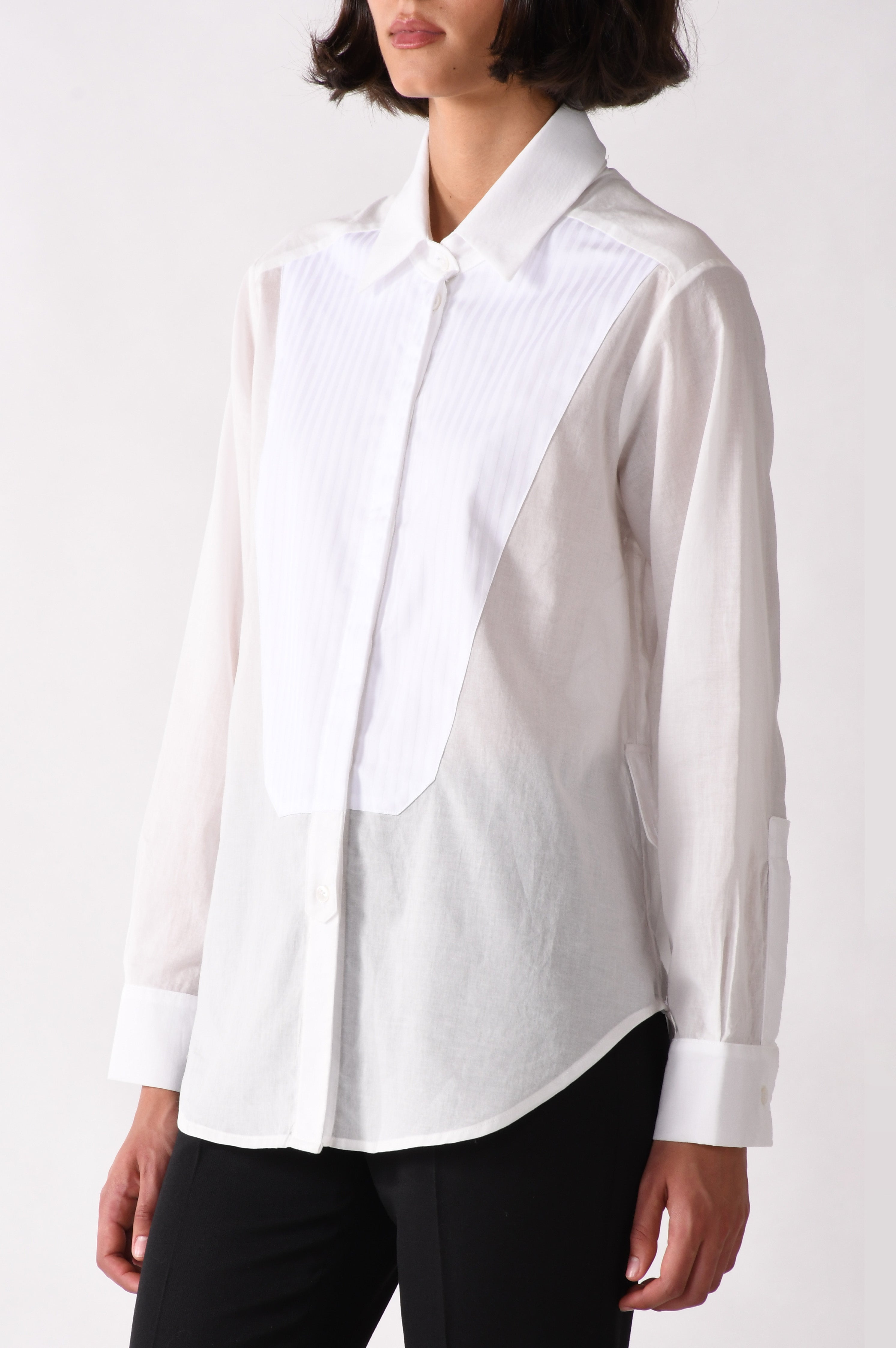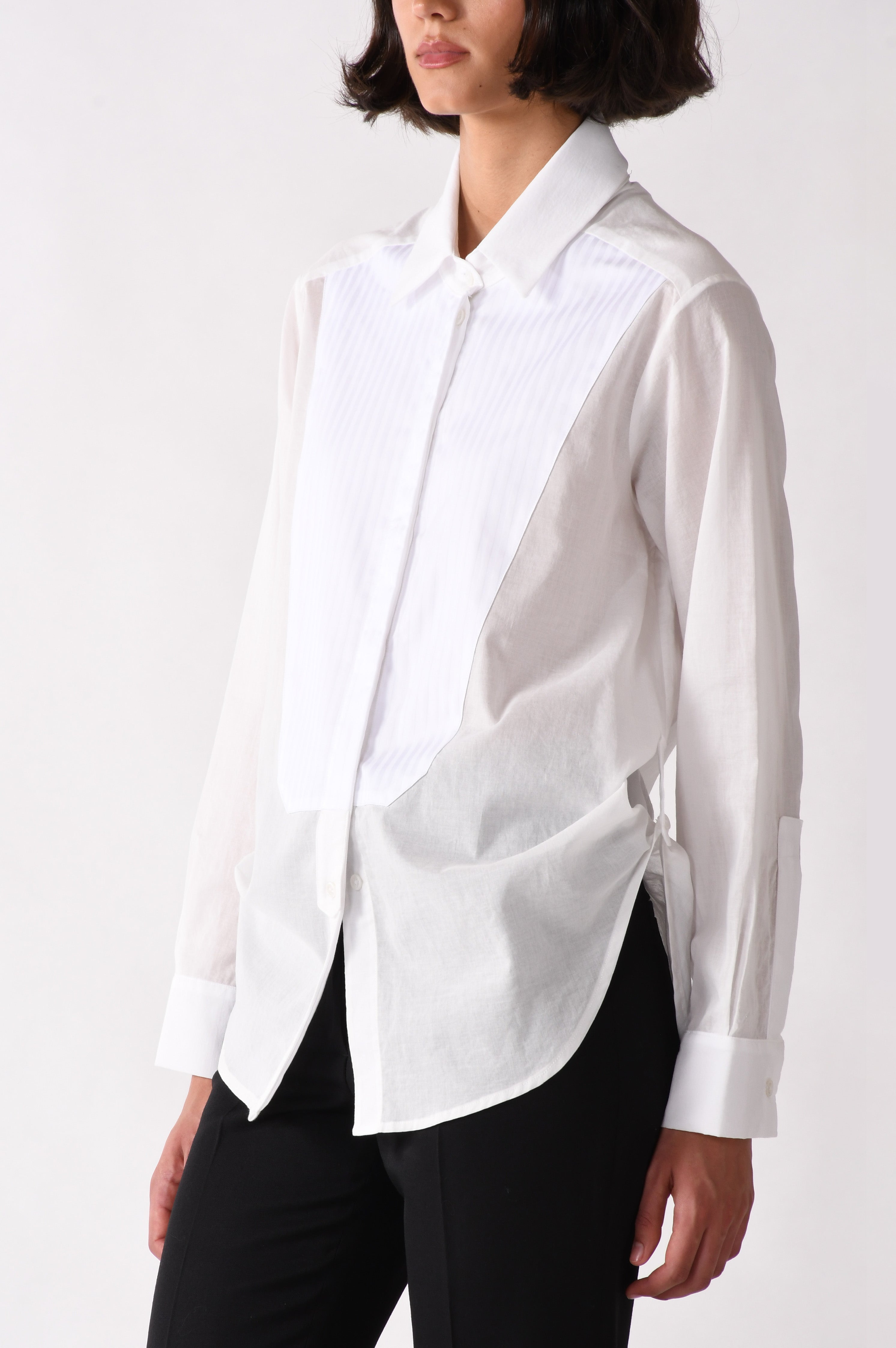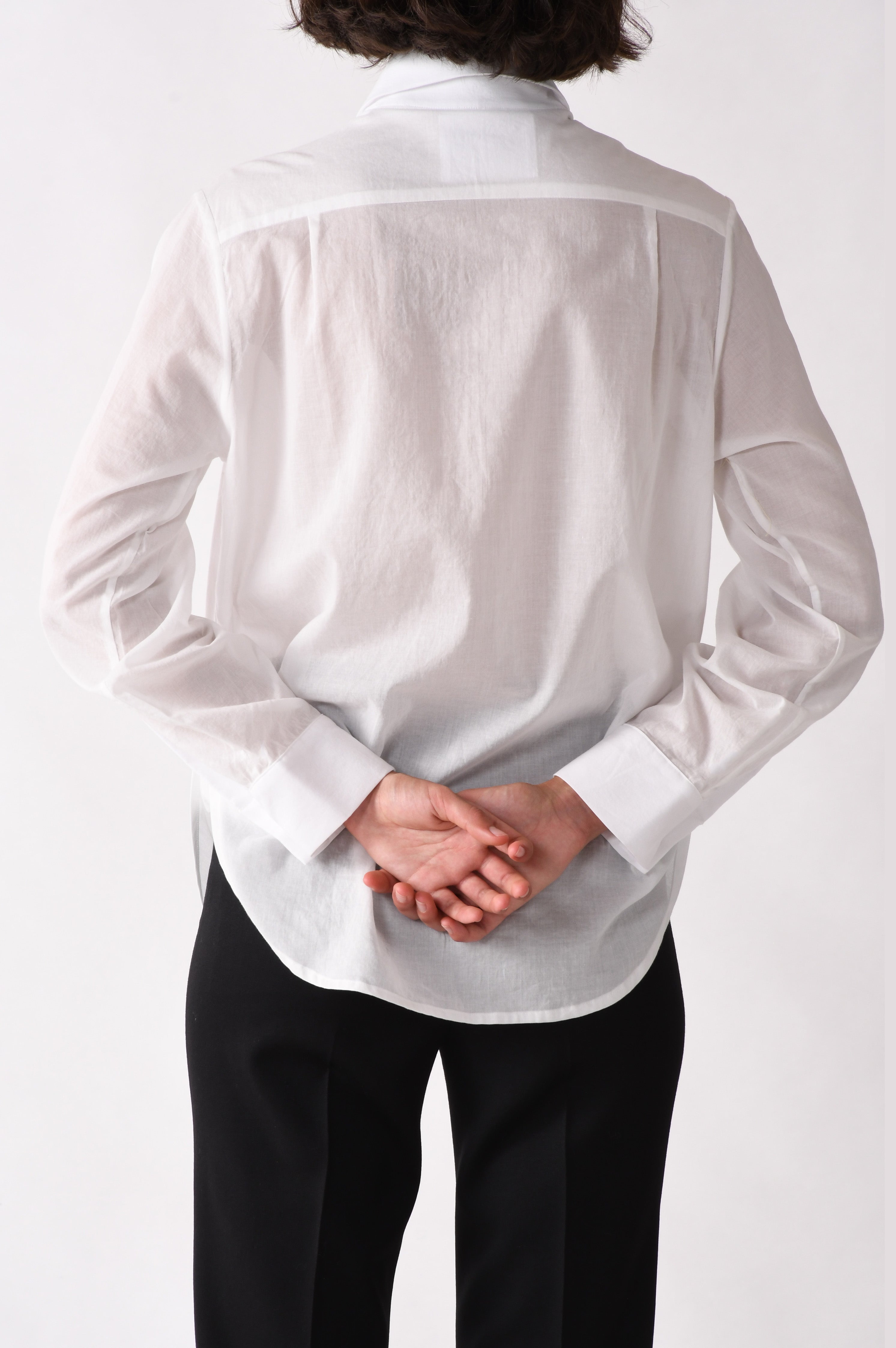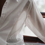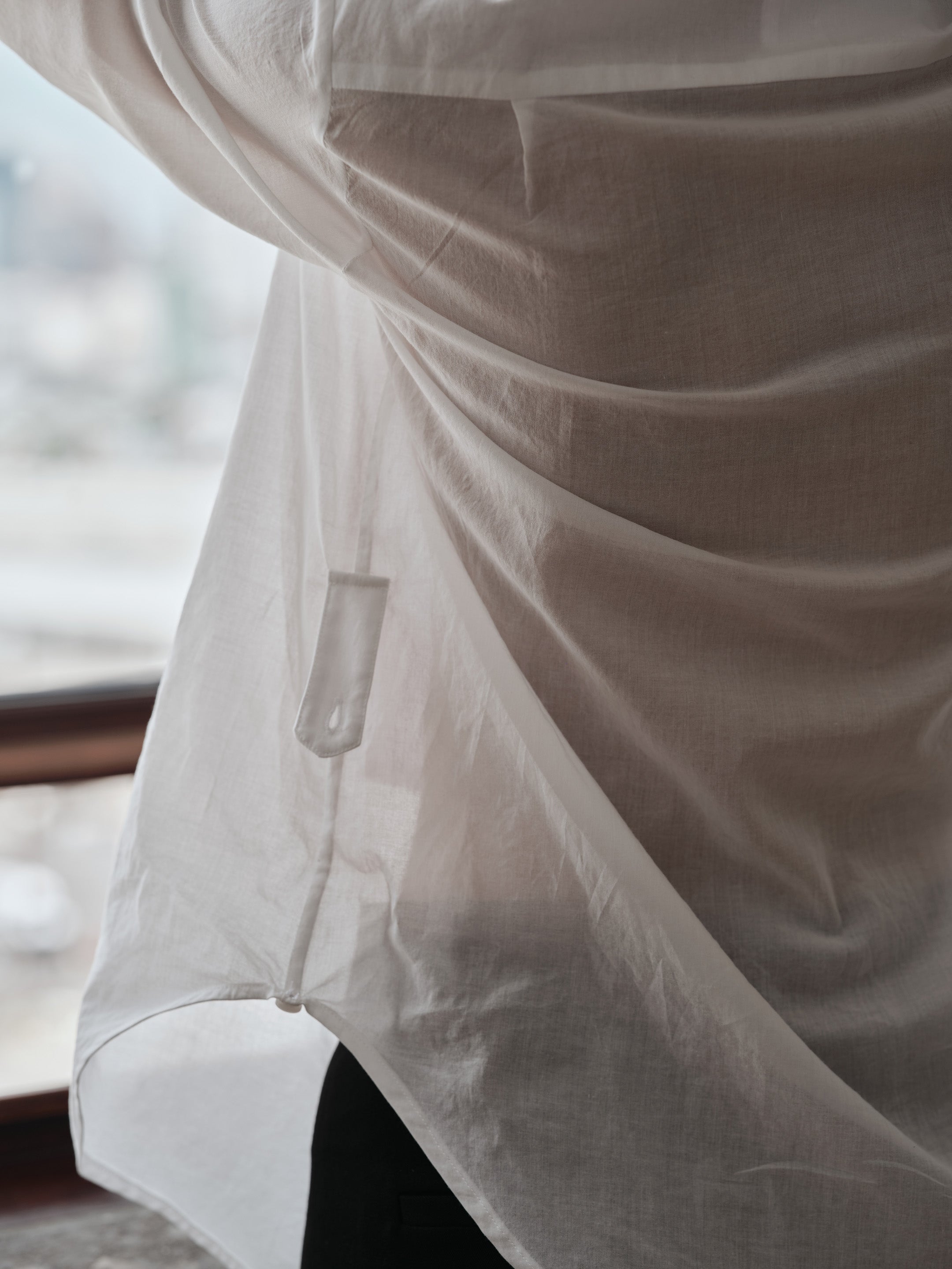 A light and airy sheer tissue cotton lawn shirt with an opaque tonal stripe bib panel cut from pure Egyptian cotton. Finished with buttoned side tabs to adjust shape and proportion. Made with real Trocas shell buttons.
