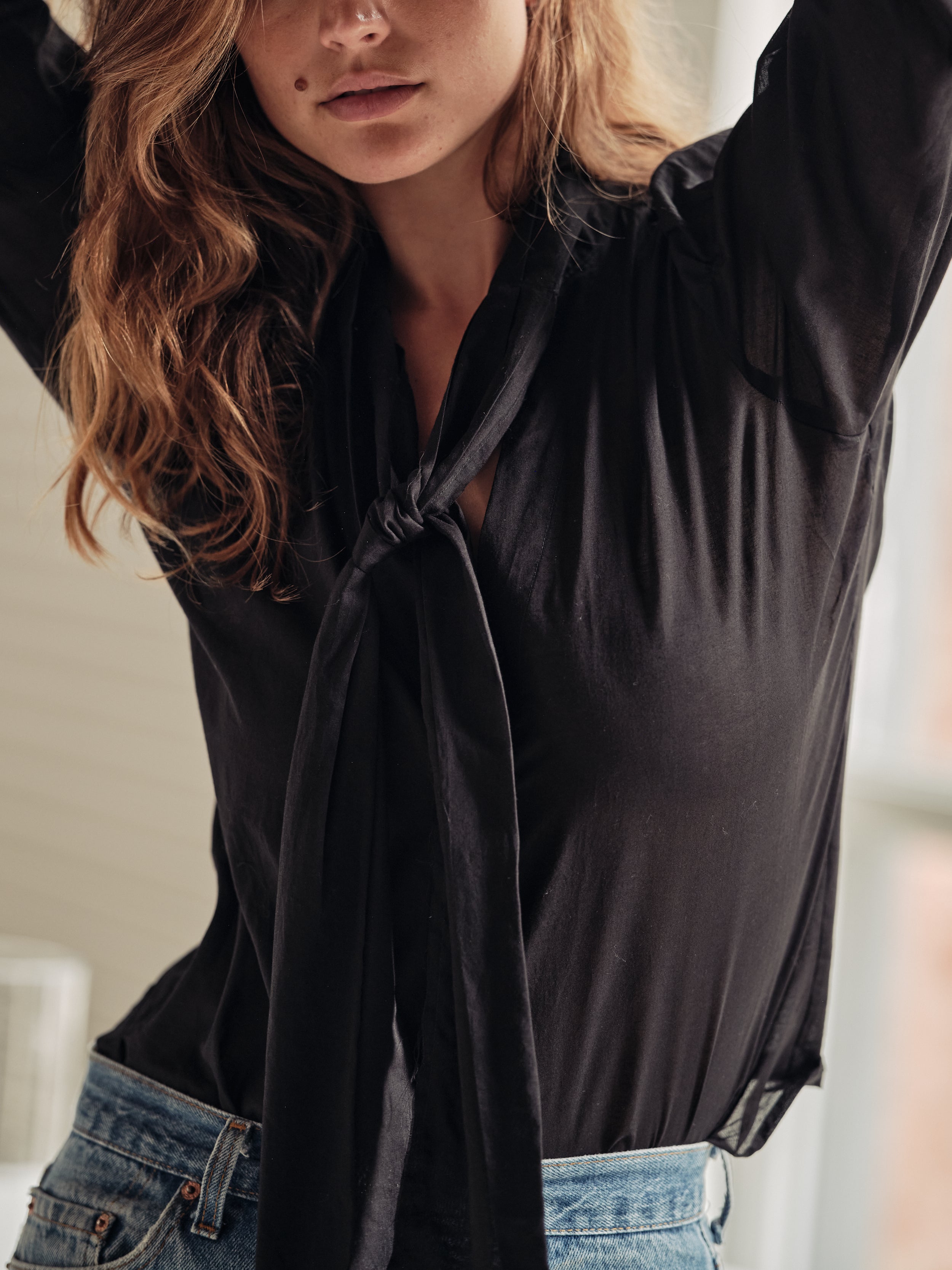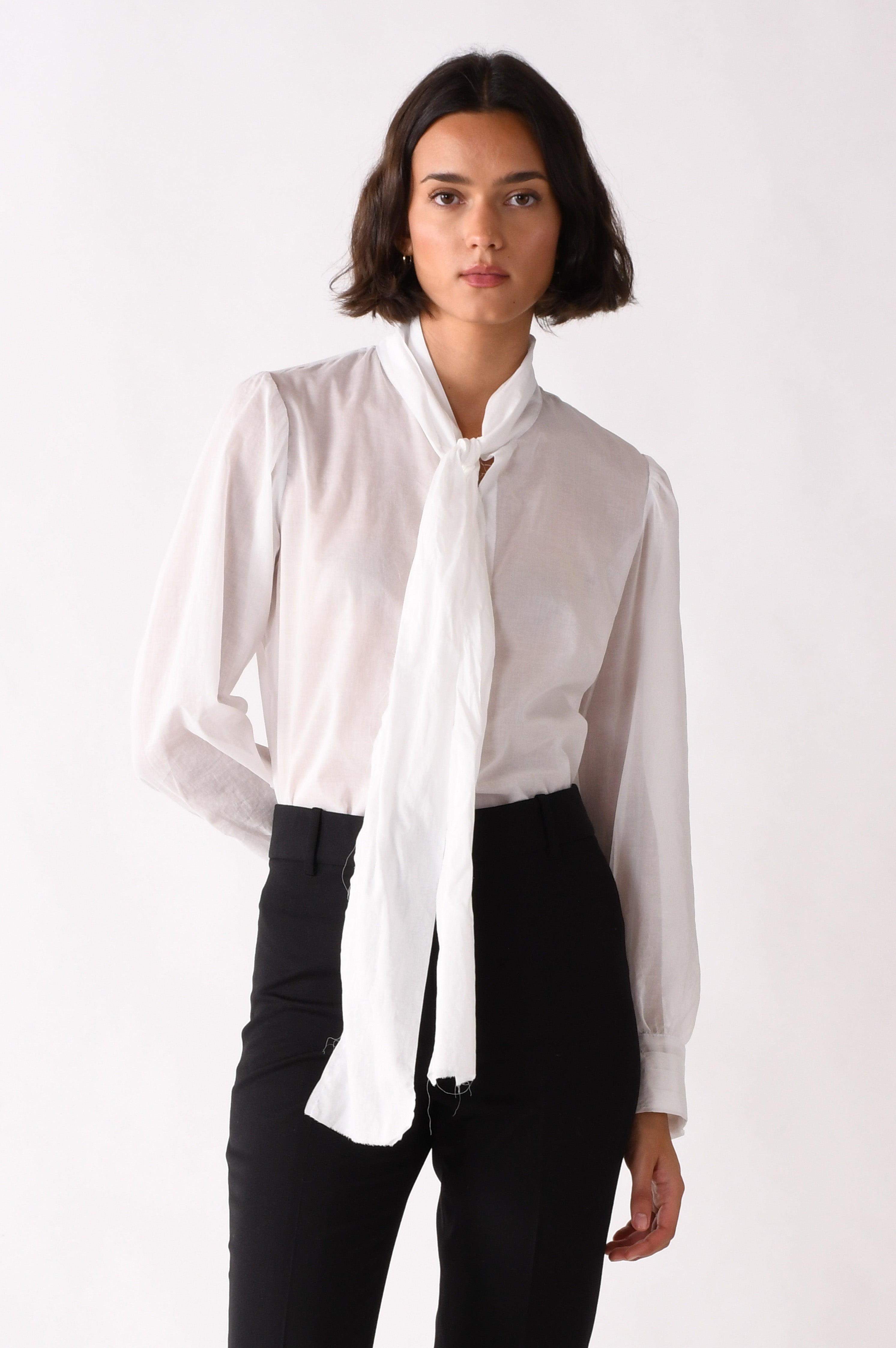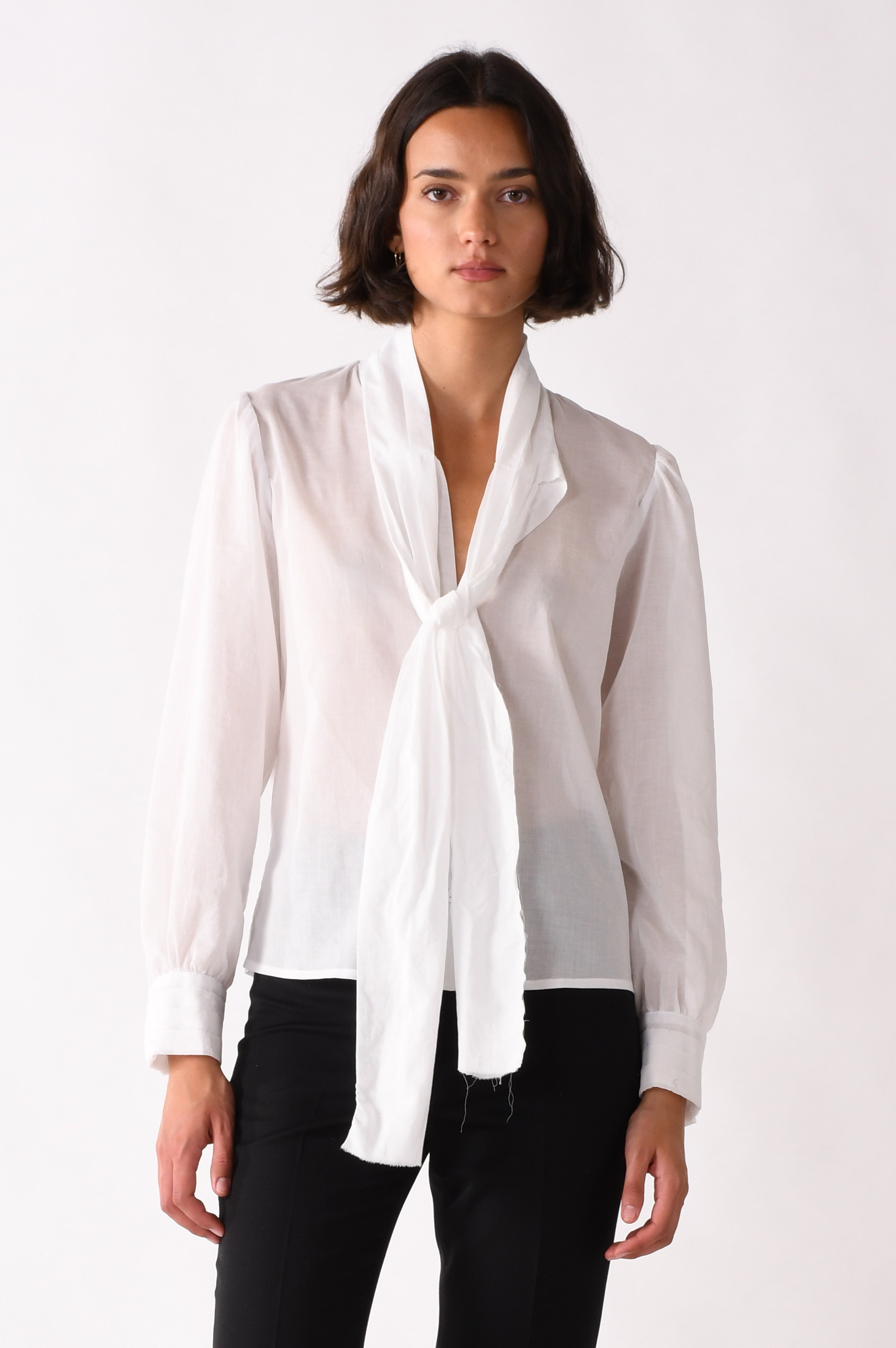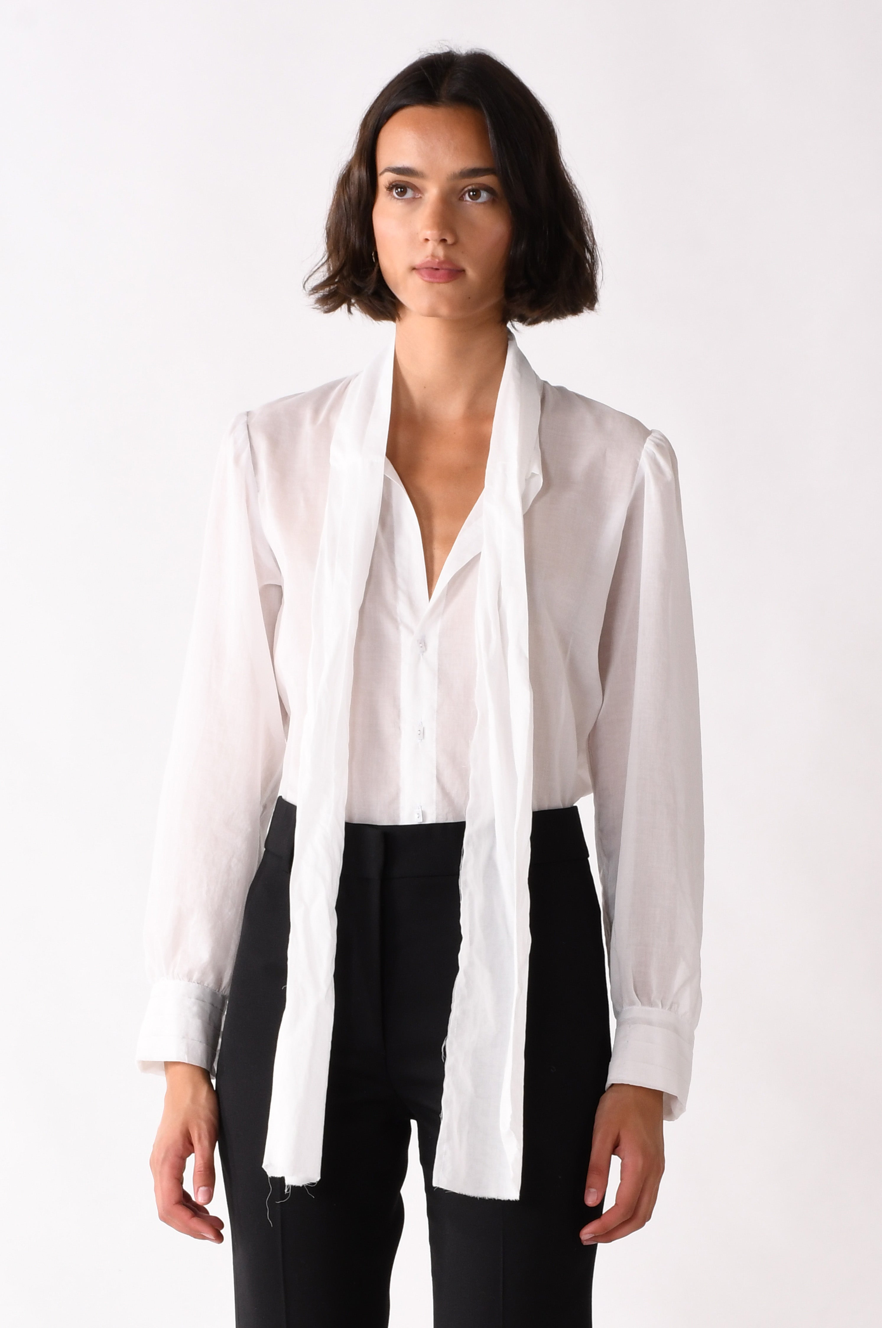 A sheer cotton lawn shirt with a soft tie that can be tied and styled in multiple ways. Cut with single-needle construction, leaving the tie and hem raw for a natural finish. Light, transparent, and made from 100% cotton with real Trocas shell buttons.