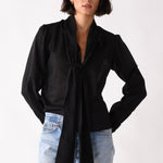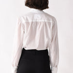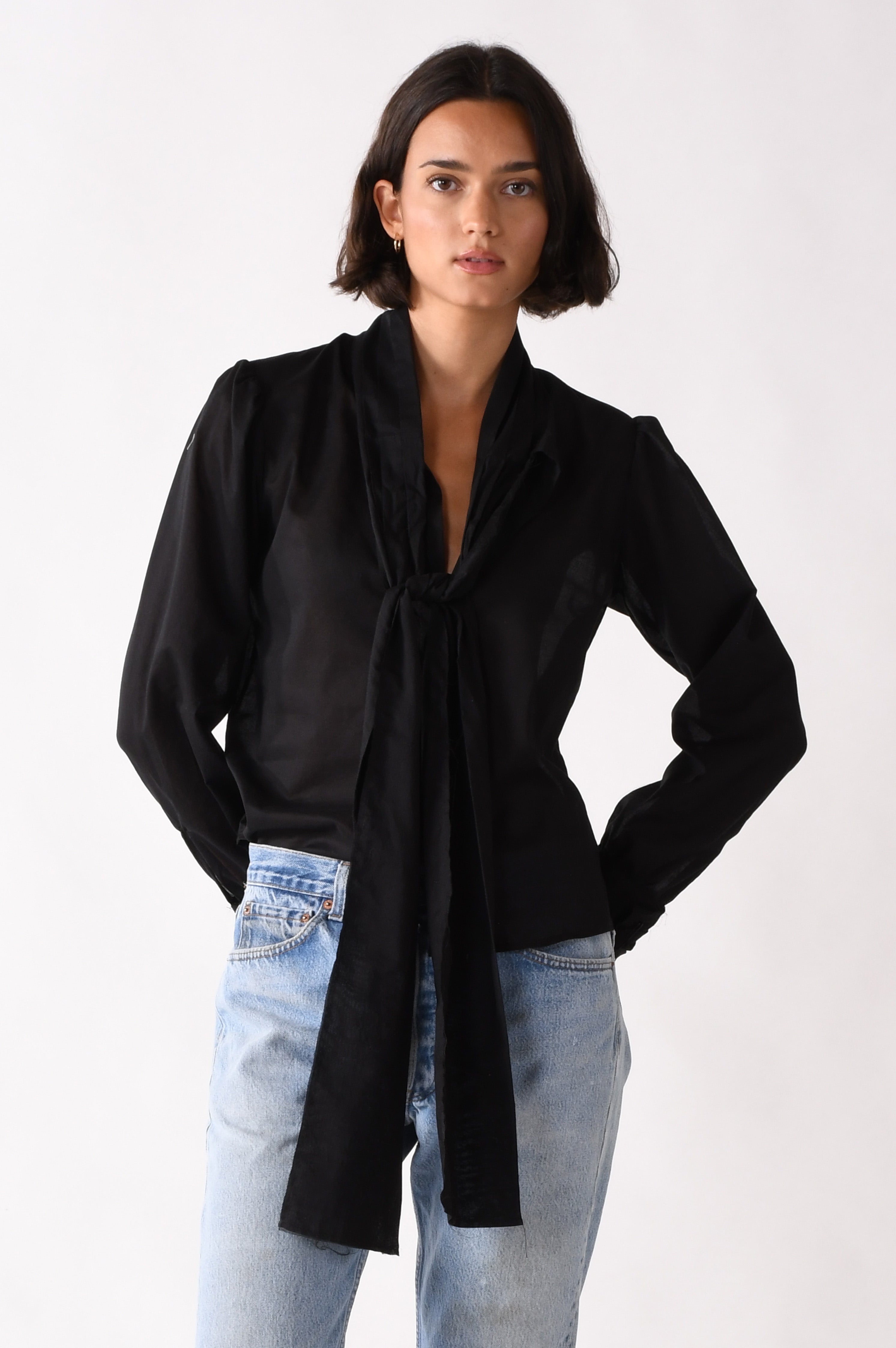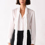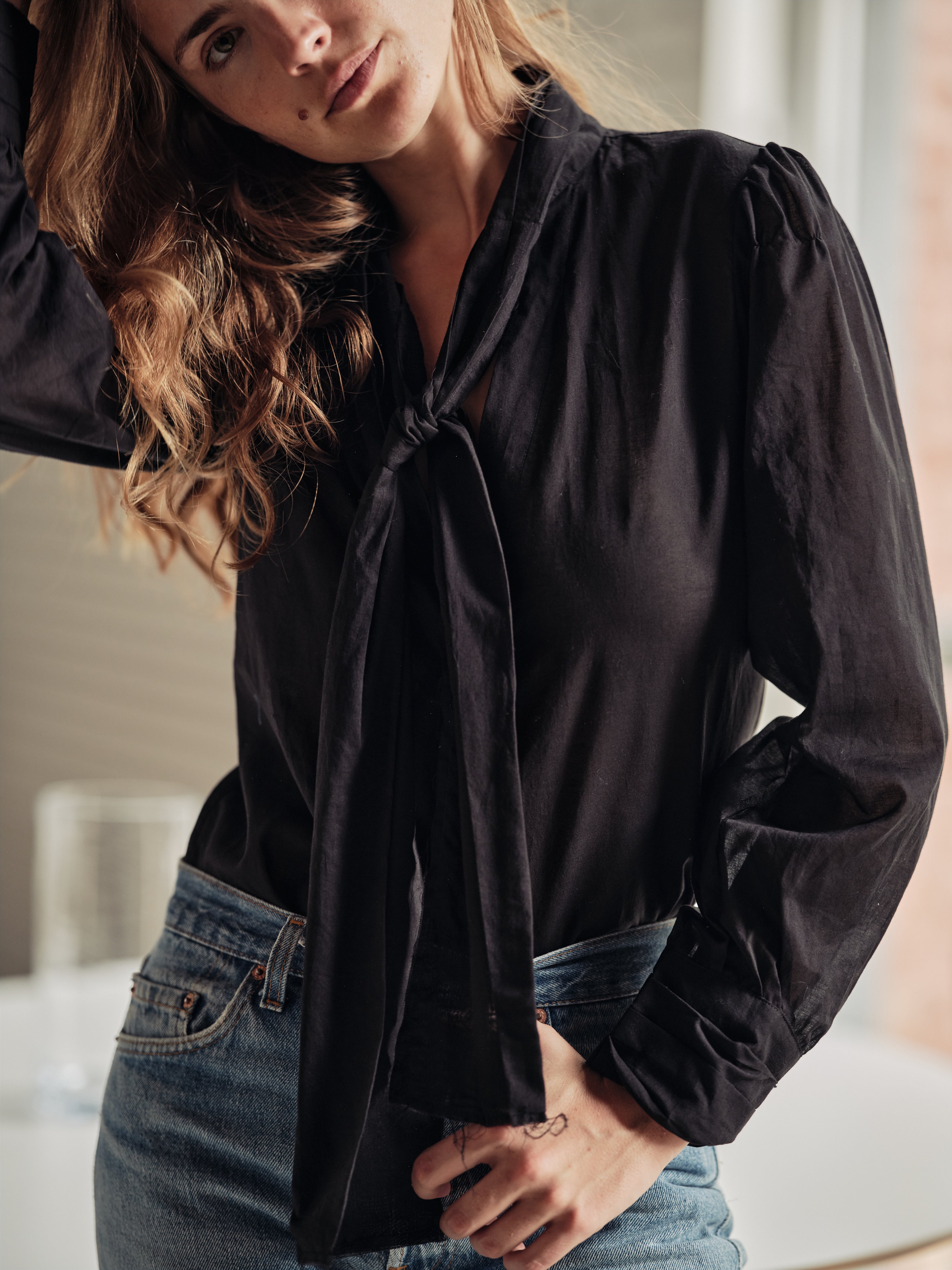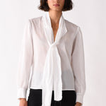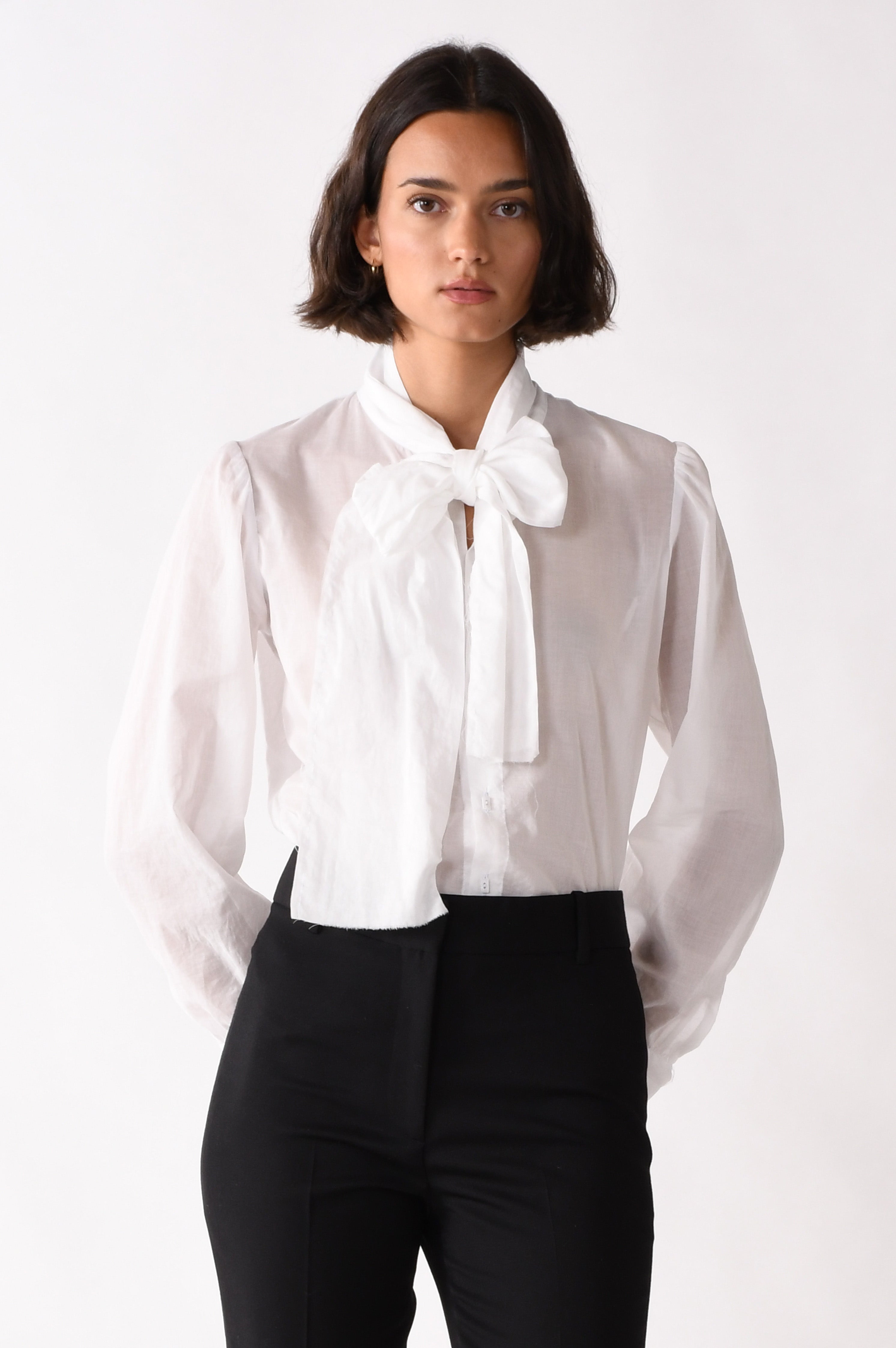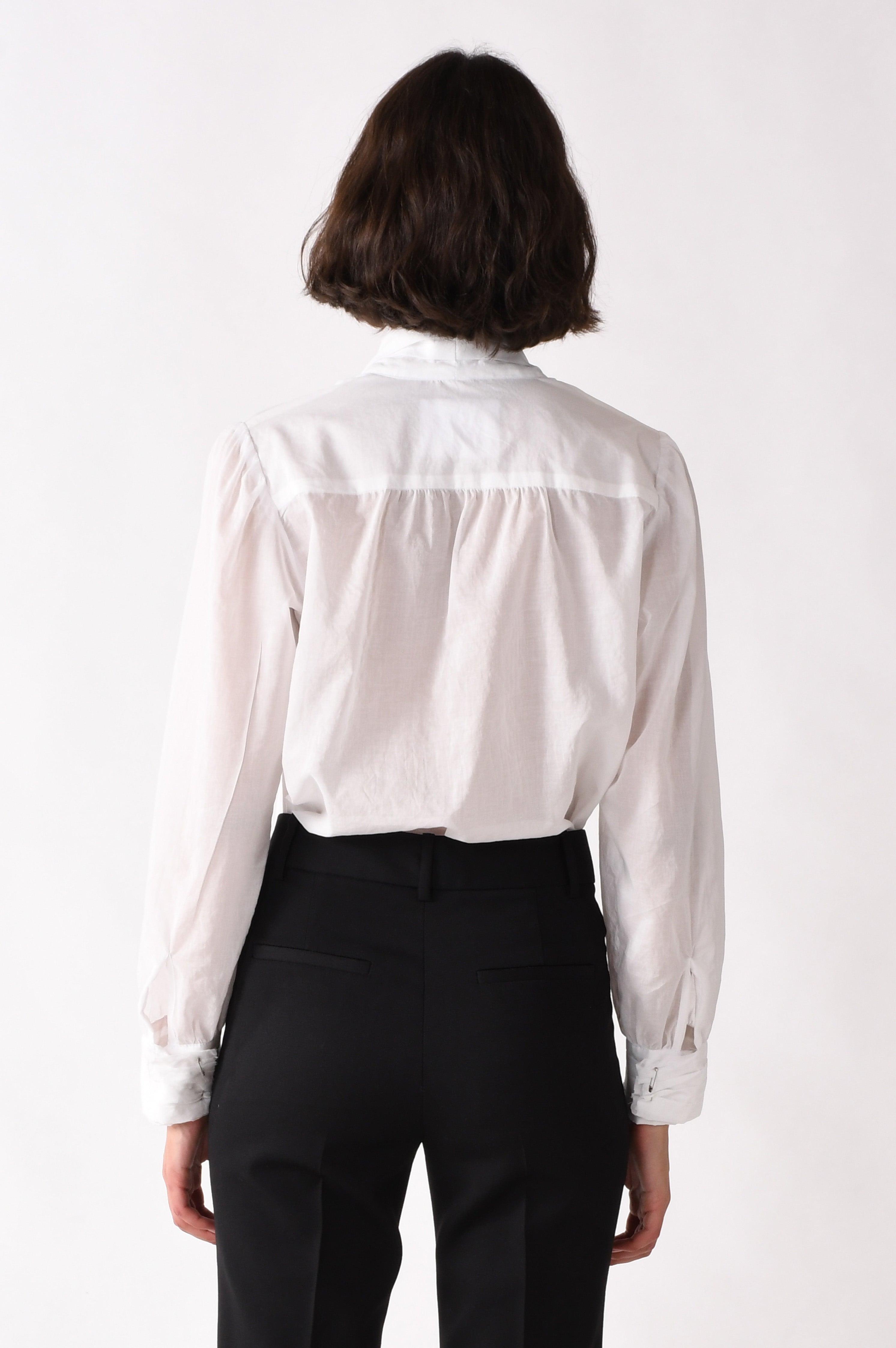 A sheer cotton lawn shirt with a soft tie that can be tied and styled in multiple ways. Cut with single-needle construction, leaving the tie and hem raw for a natural finish. Light, transparent, and made from 100% cotton with real Trocas shell buttons.