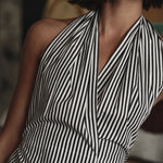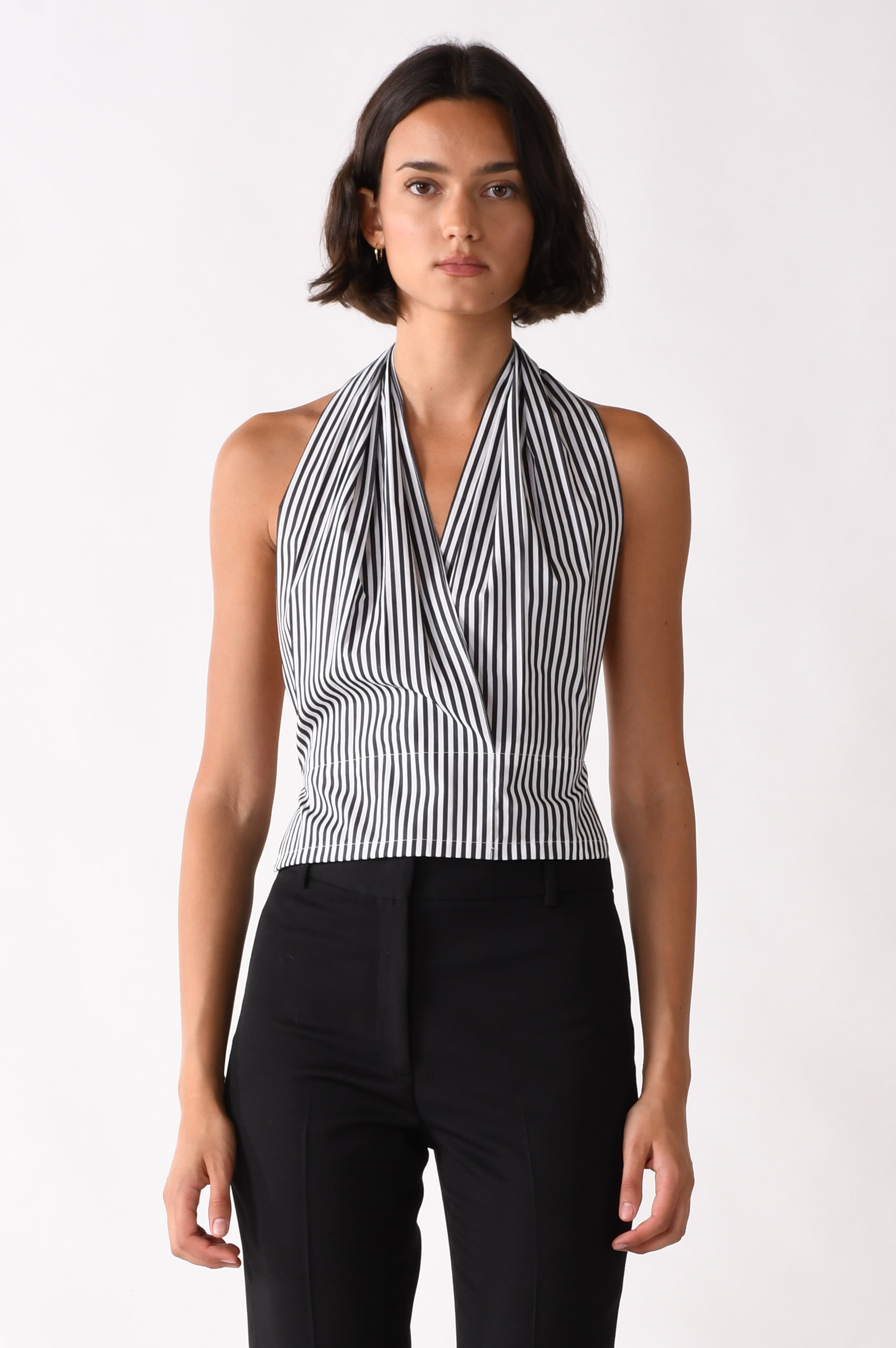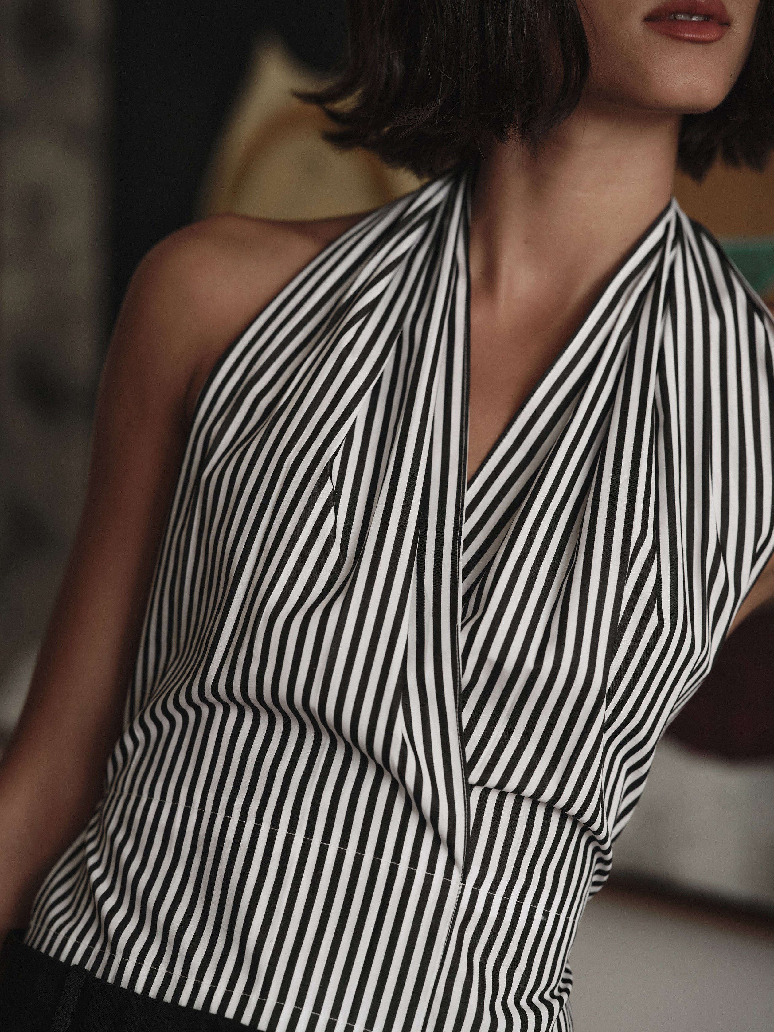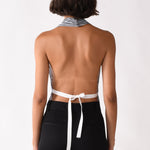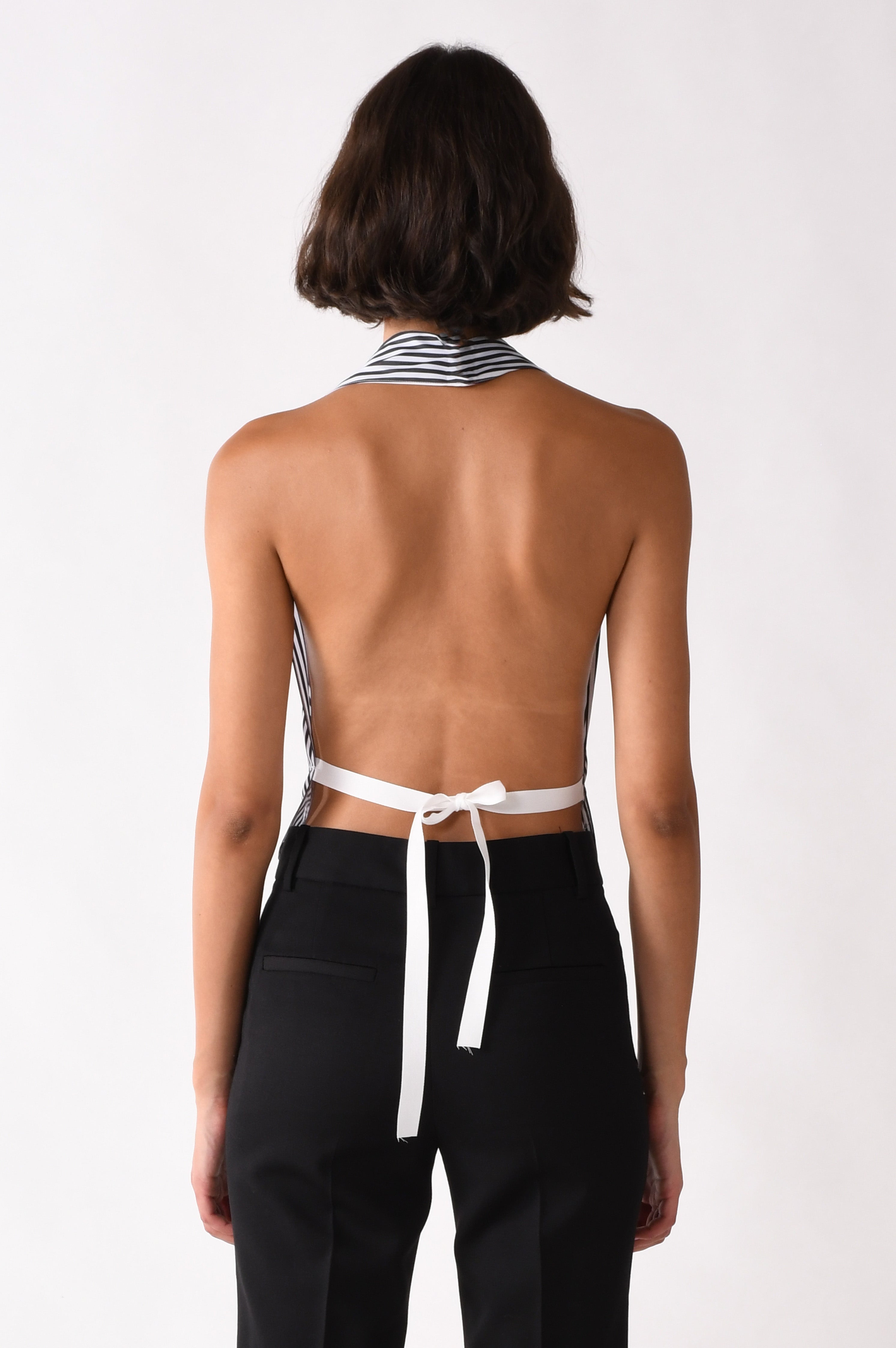 The Halter Top features an open back and ties with a 100% grosgrain ribbon at the back. Wear it alone or style it as a decorative underpinning.