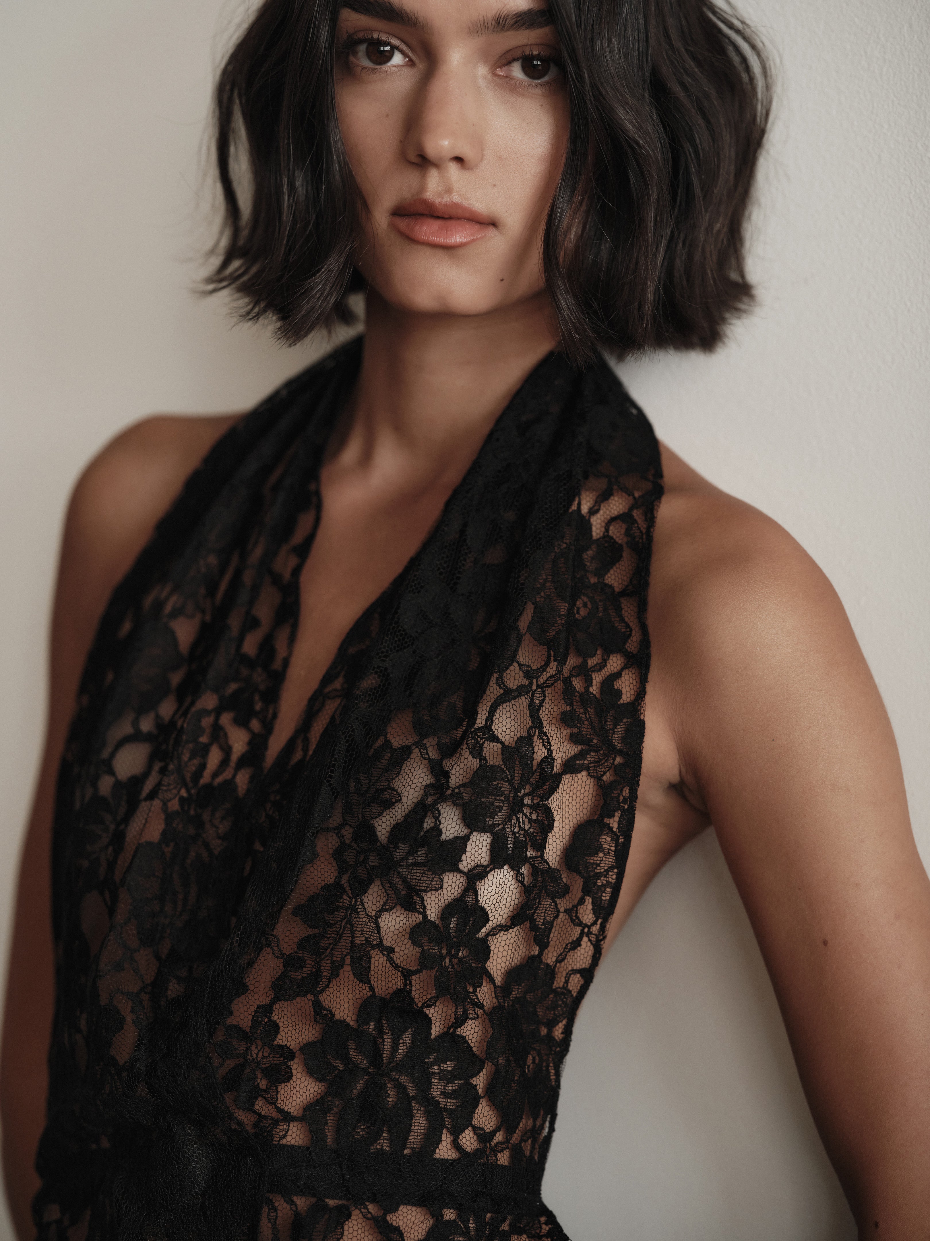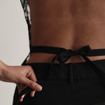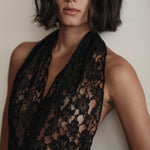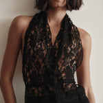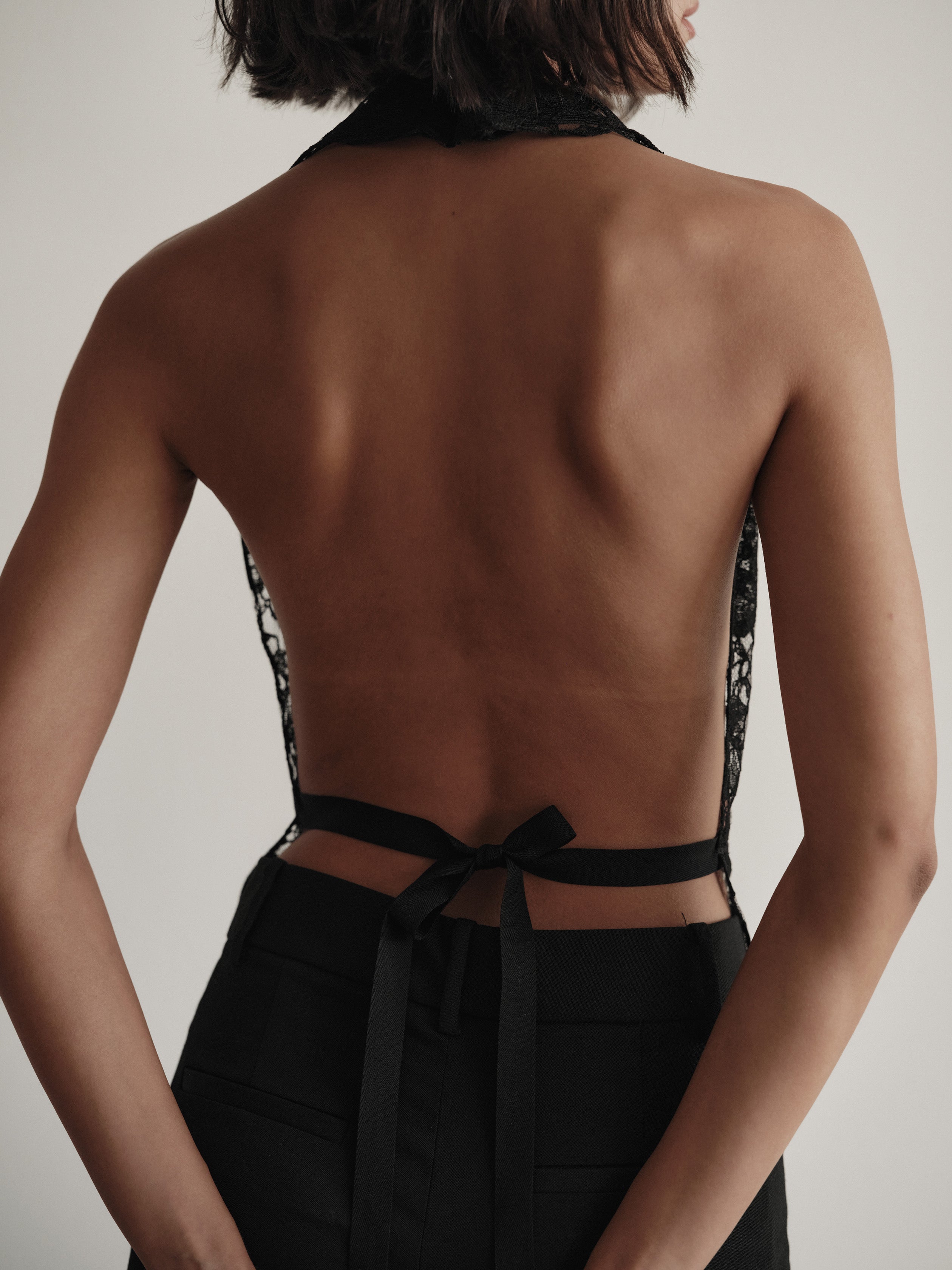 The Halter Top features an open back and ties with a 100% grosgrain ribbon at the back. Wear it alone or layer it to add a hint of lace.