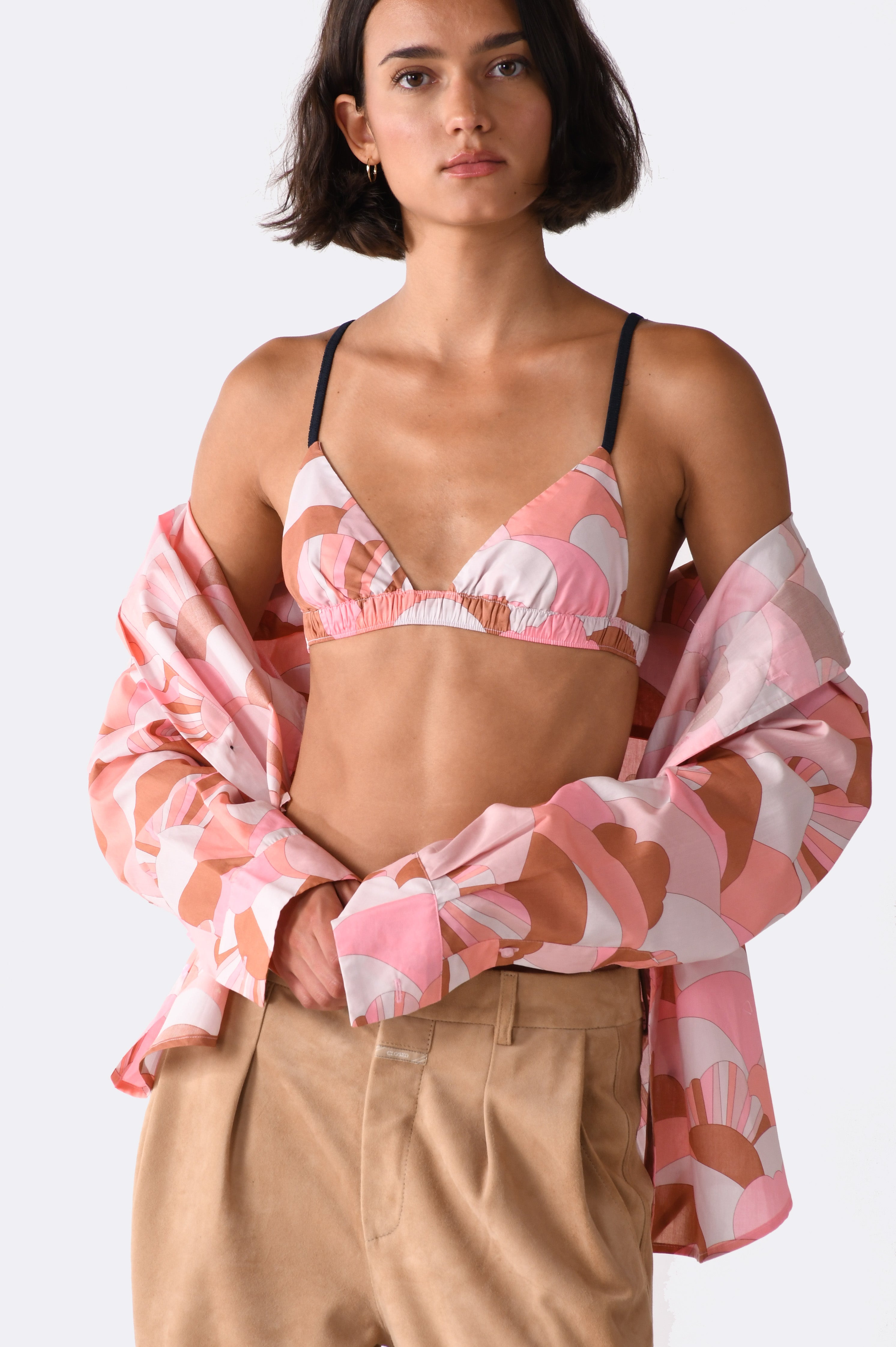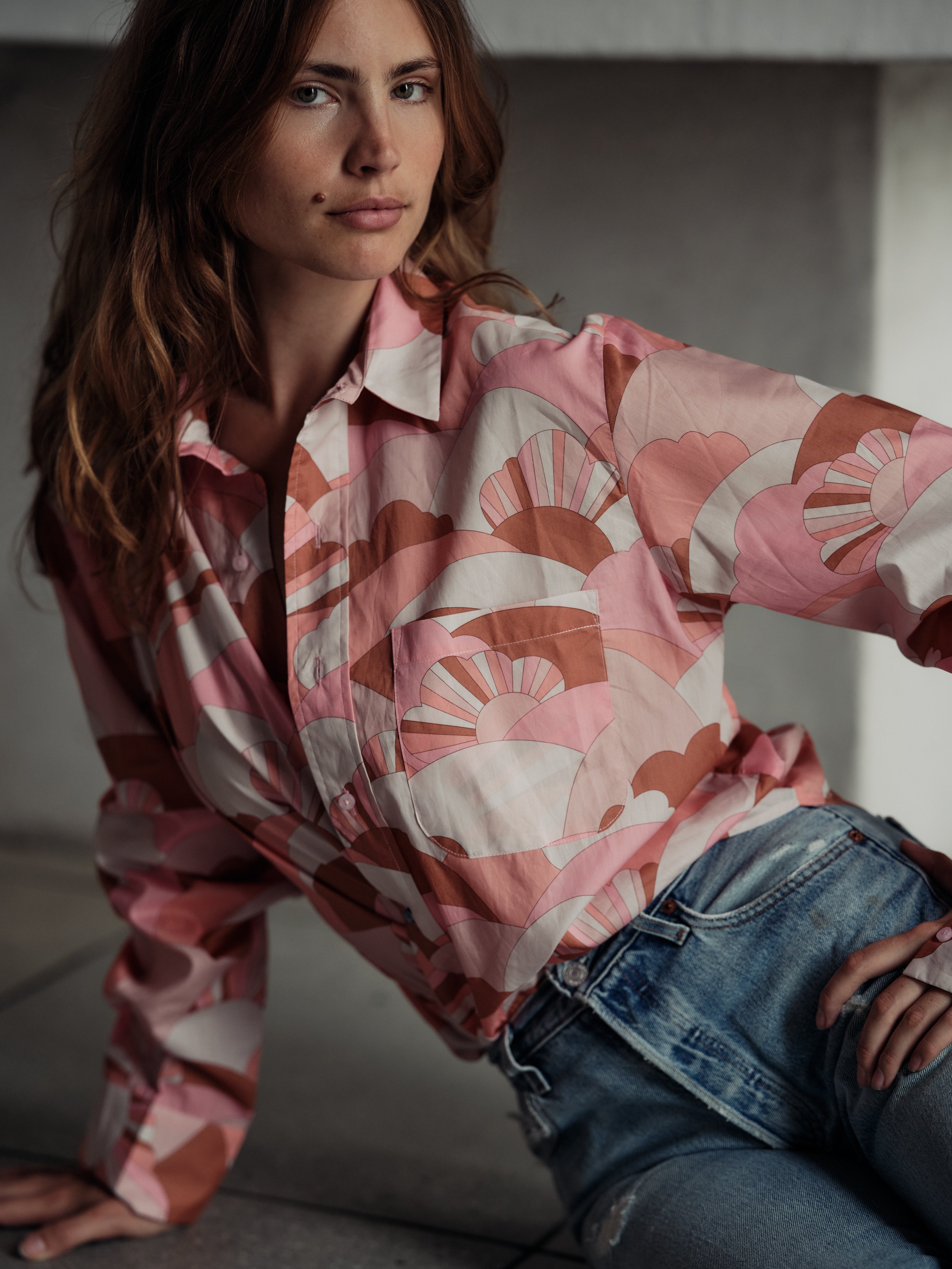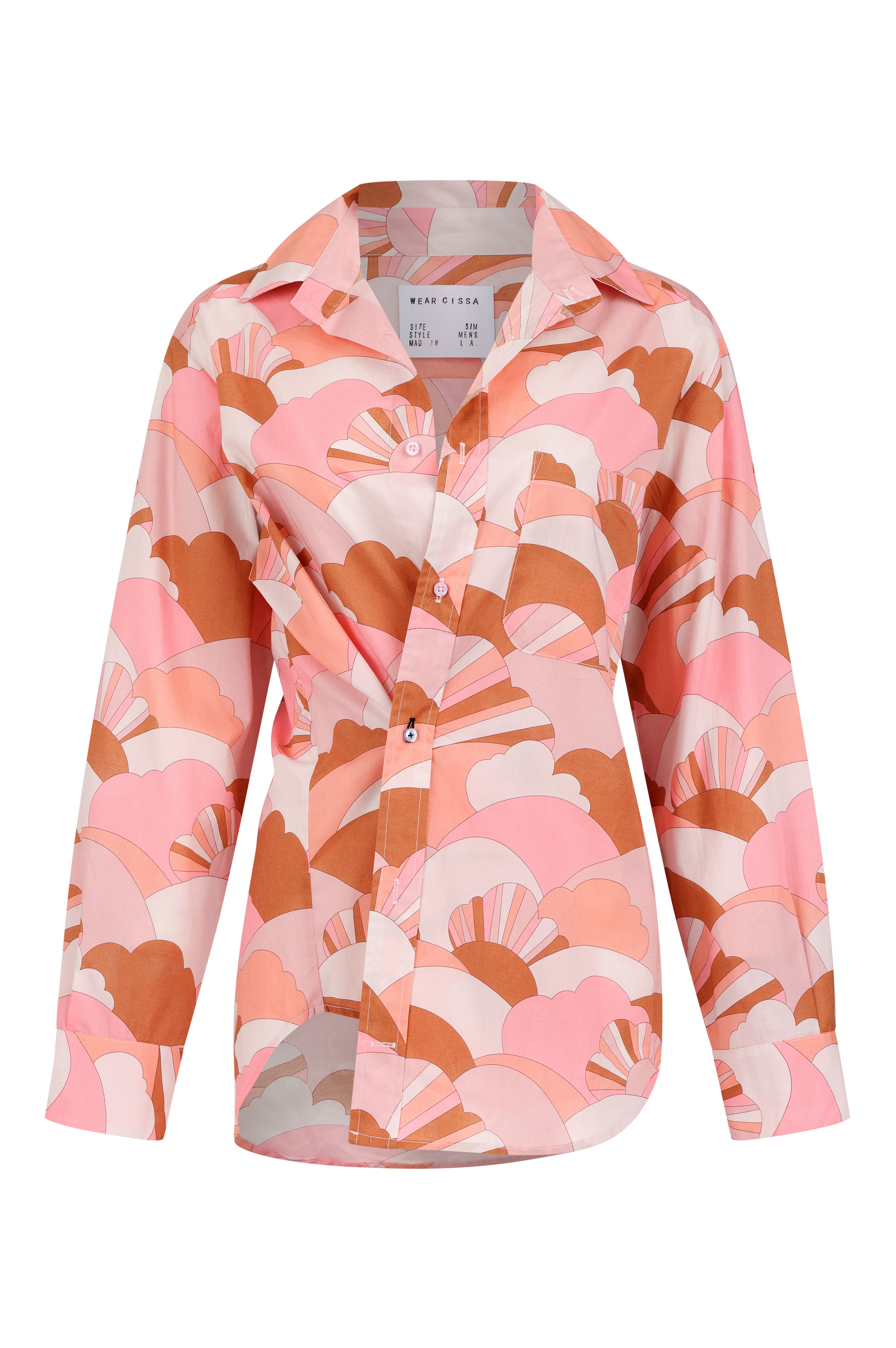 Relaxed fit, front single pocket, two knife pleats at back yoke. Signature contrast pink buttons, and navy contrast buttonhole details that serve as a wrapping template.