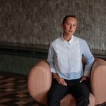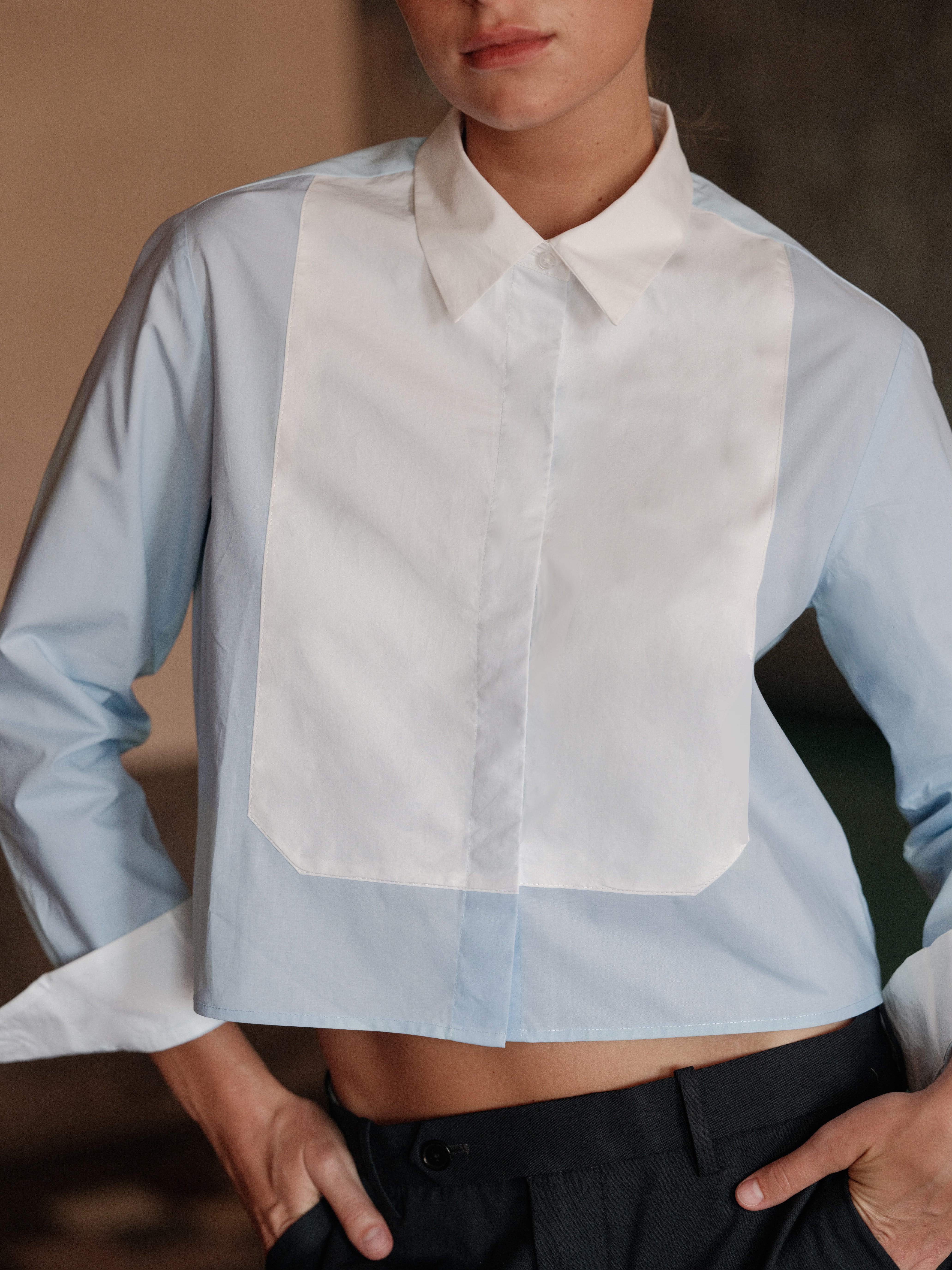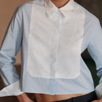 A slightly cropped contemporary take on a traditional bib front shirt.  This style offered with a contrast bib front panel.