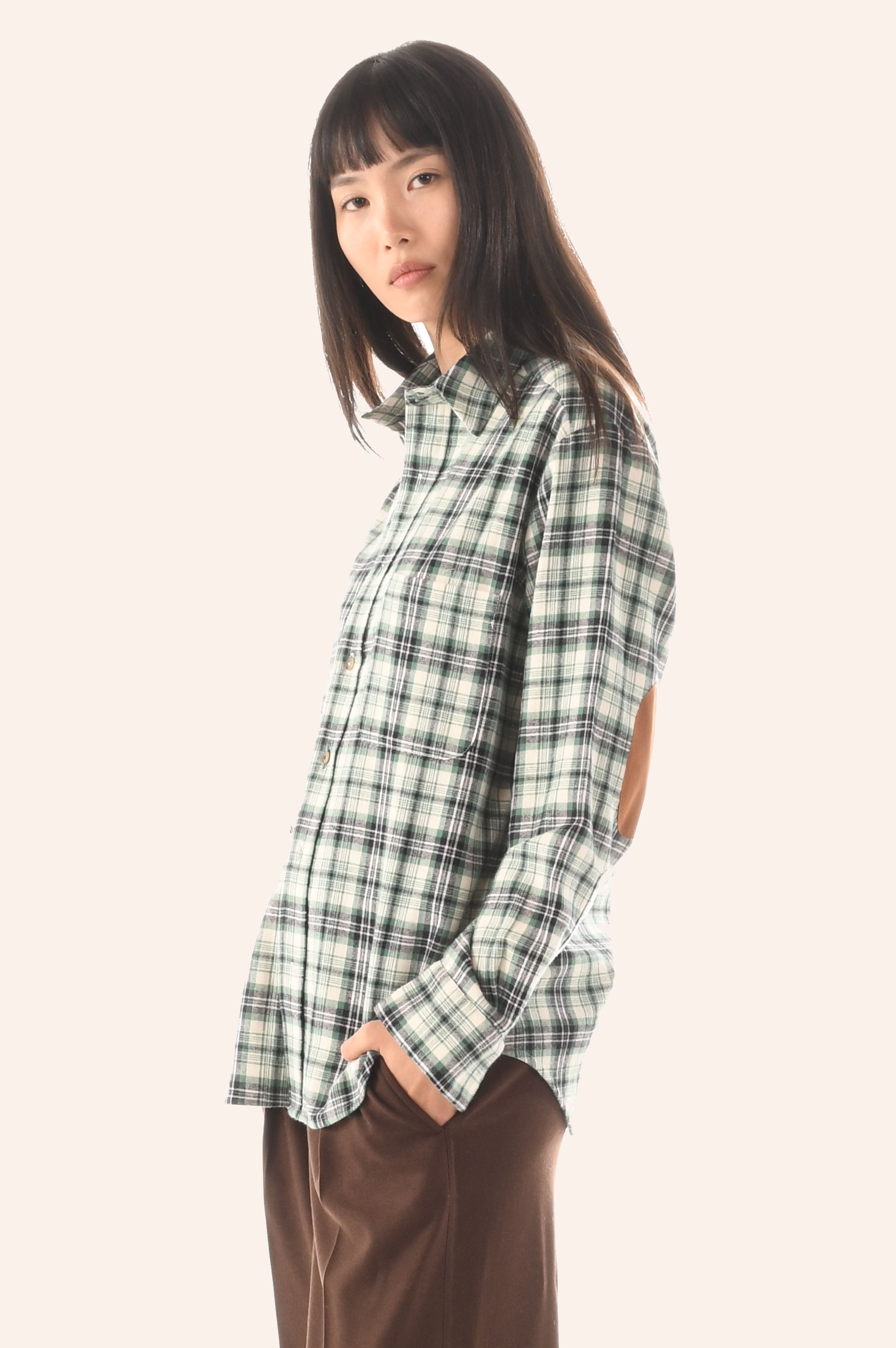 Relaxed fit, front single pocket, two knife pleats at back yoke.