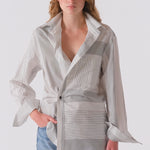 Designed to be worn two ways: buttoned traditionally for a classic and clean look or crossed to create a wrapped look.