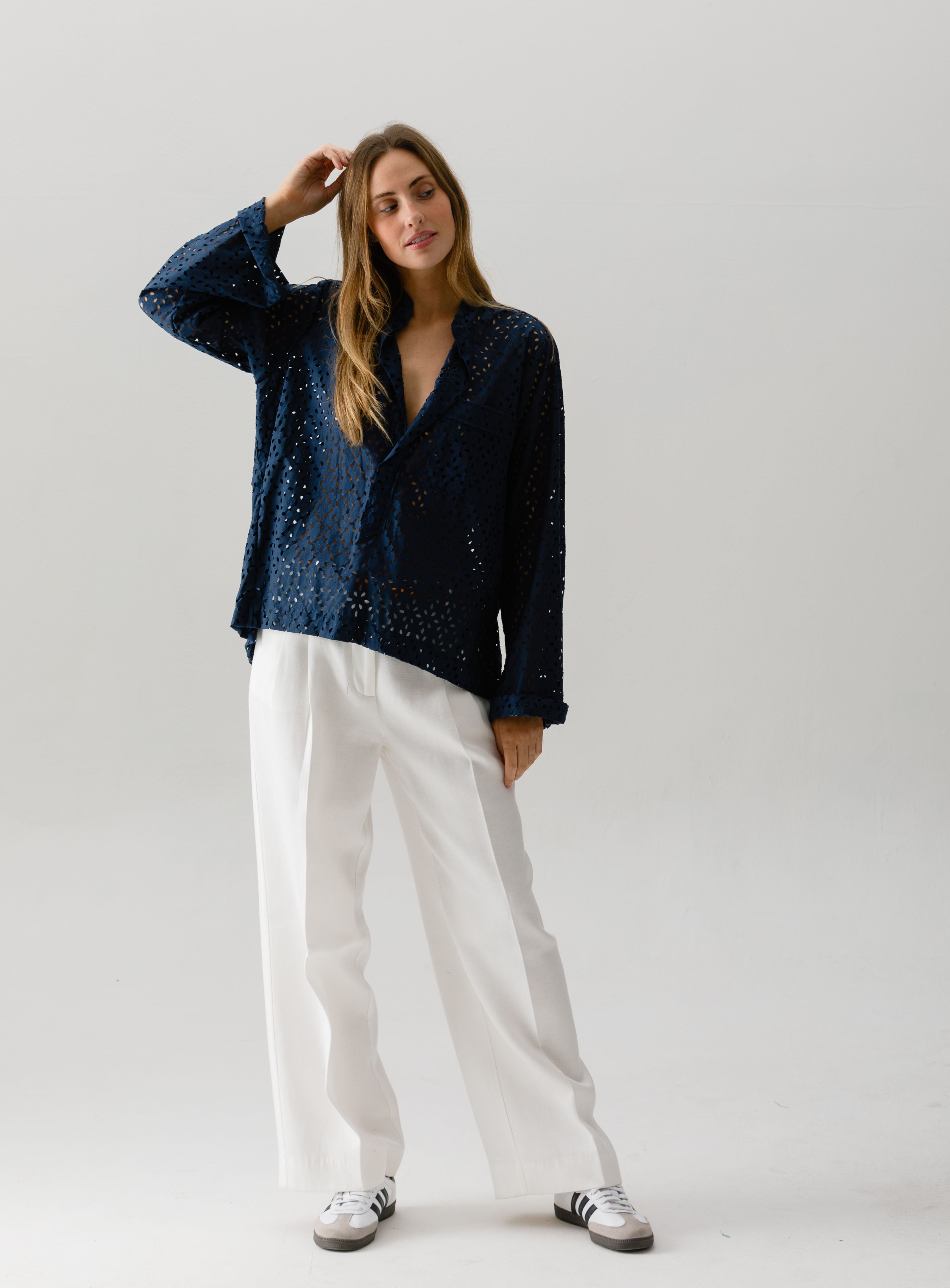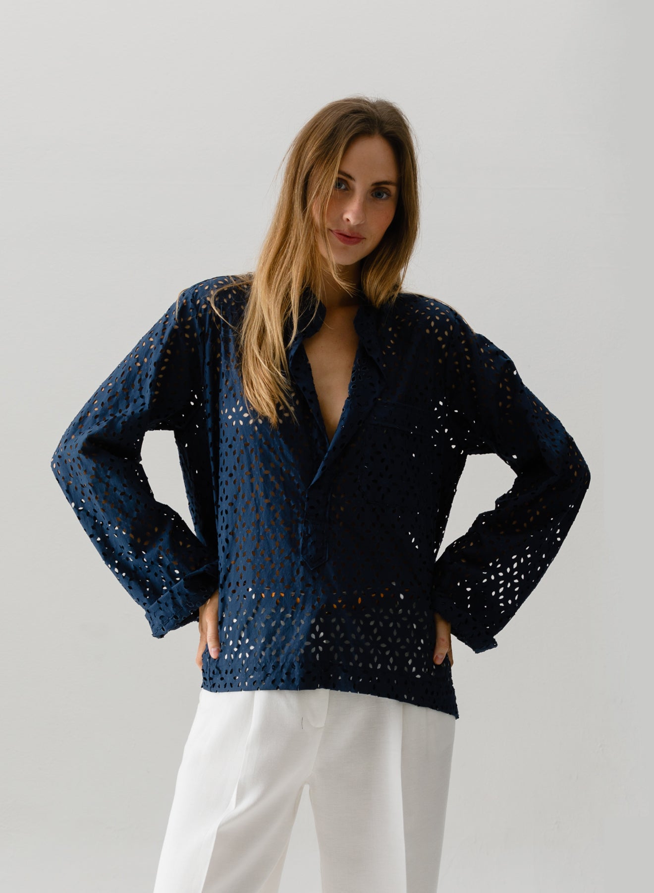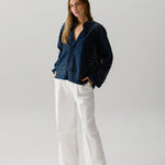 Relaxed pull on style utilitarian style shirting, hardware free with novel side seaming details