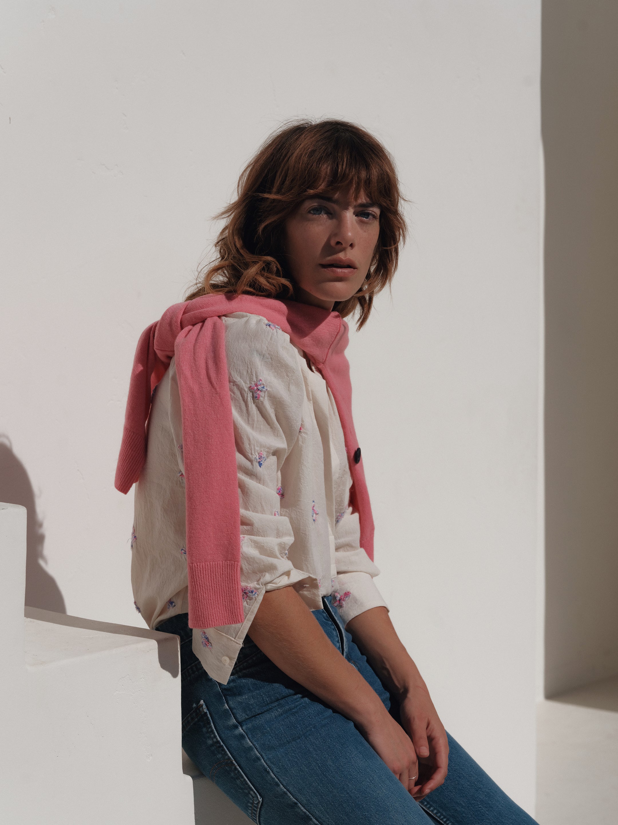 A wardrobe staple that can be worn regularly or wrapped. When wrapped it gently hugs the torso giving a flattering and form fitting look. Signature contrast pink buttons and buttonhole details serve as a wrapping template.