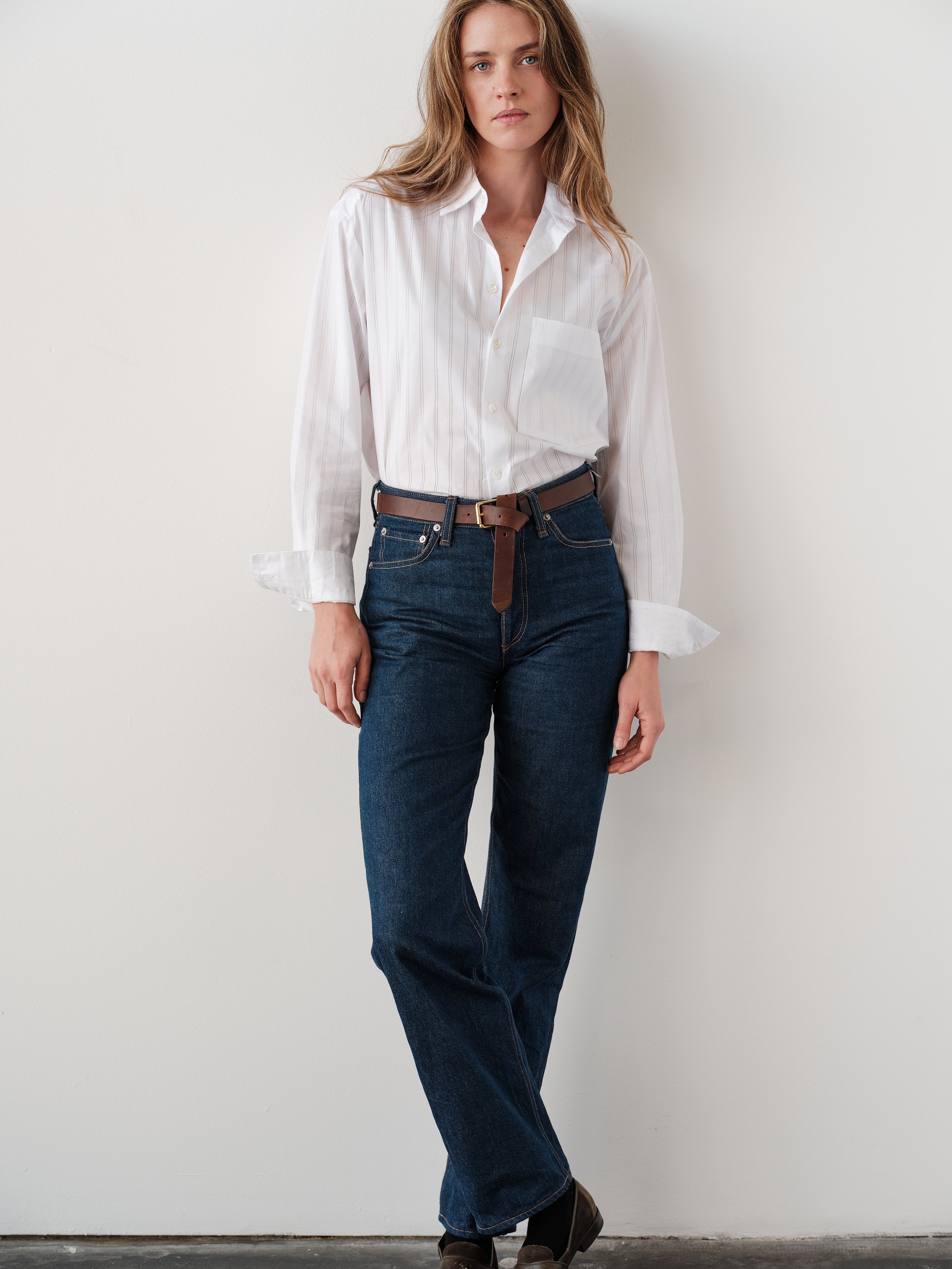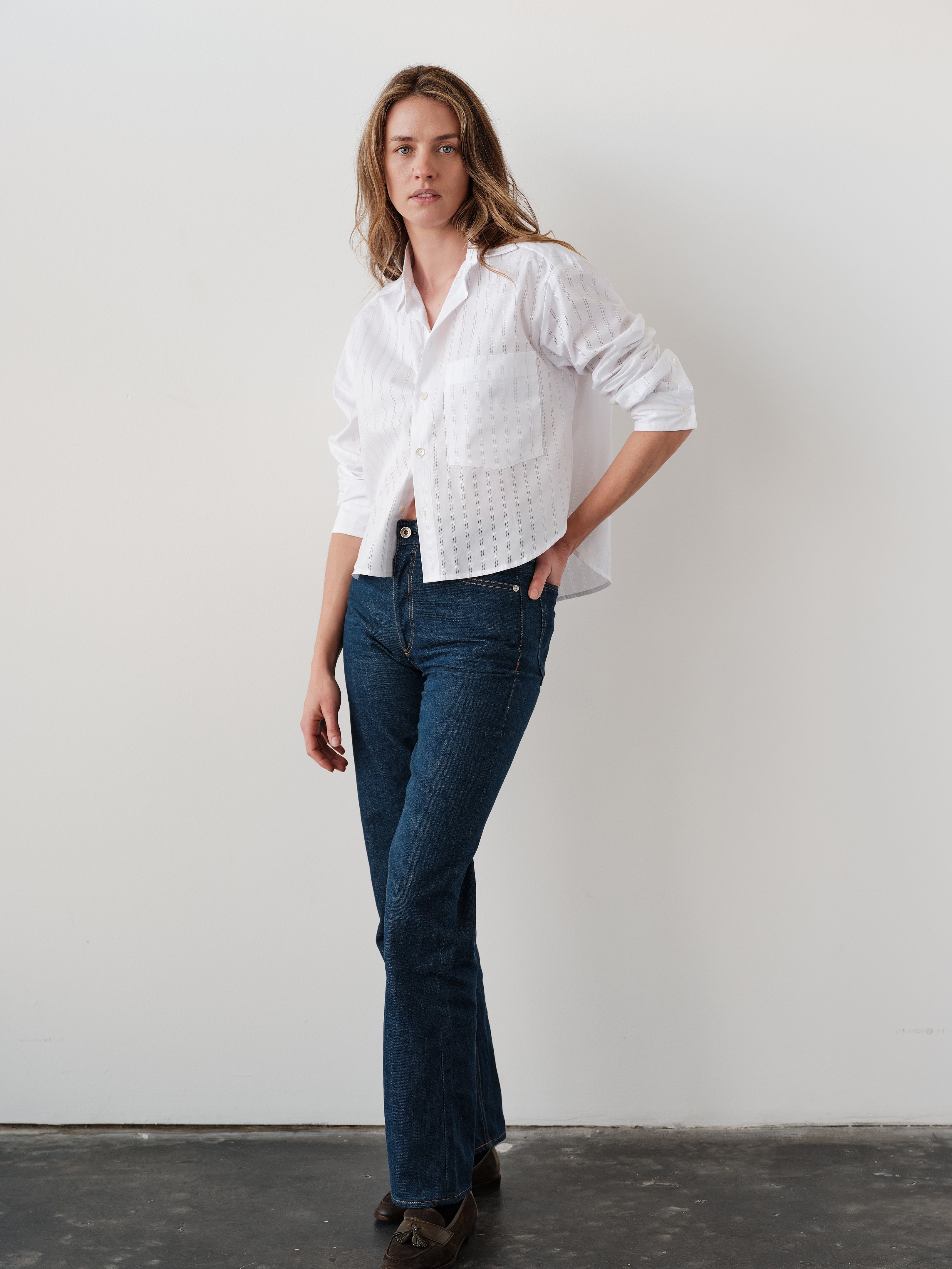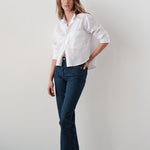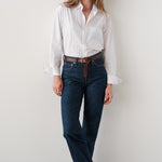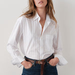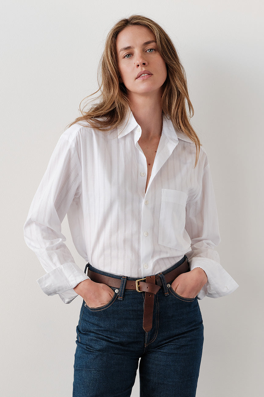 The Belle shirt in white is crafted from crisp cotton. The solid white surface carries a subtle punctured needle stripe that gives soft texture. It is finished with real trocca shell buttons.