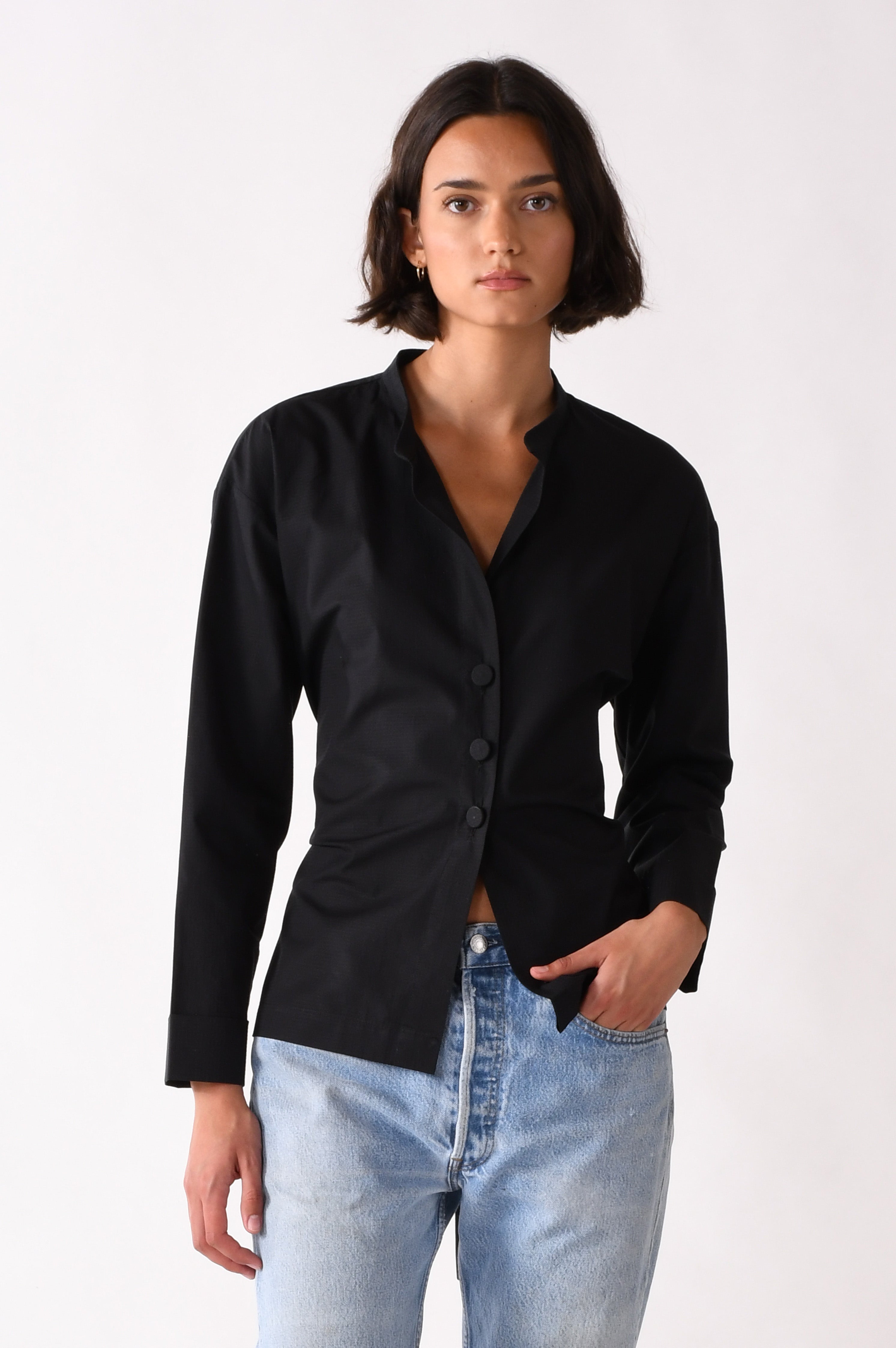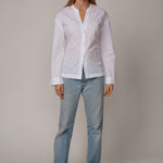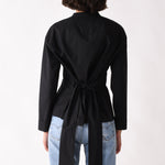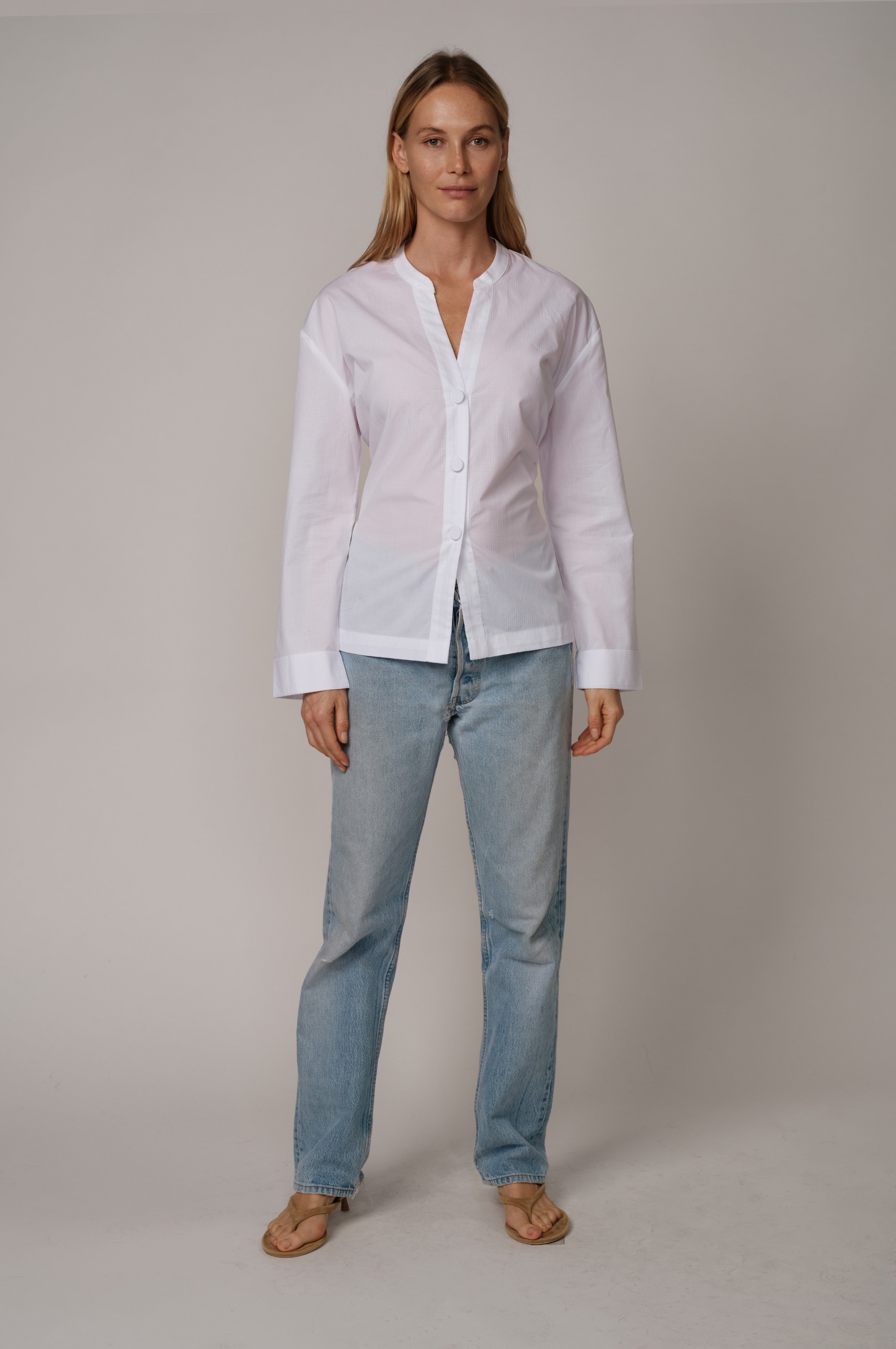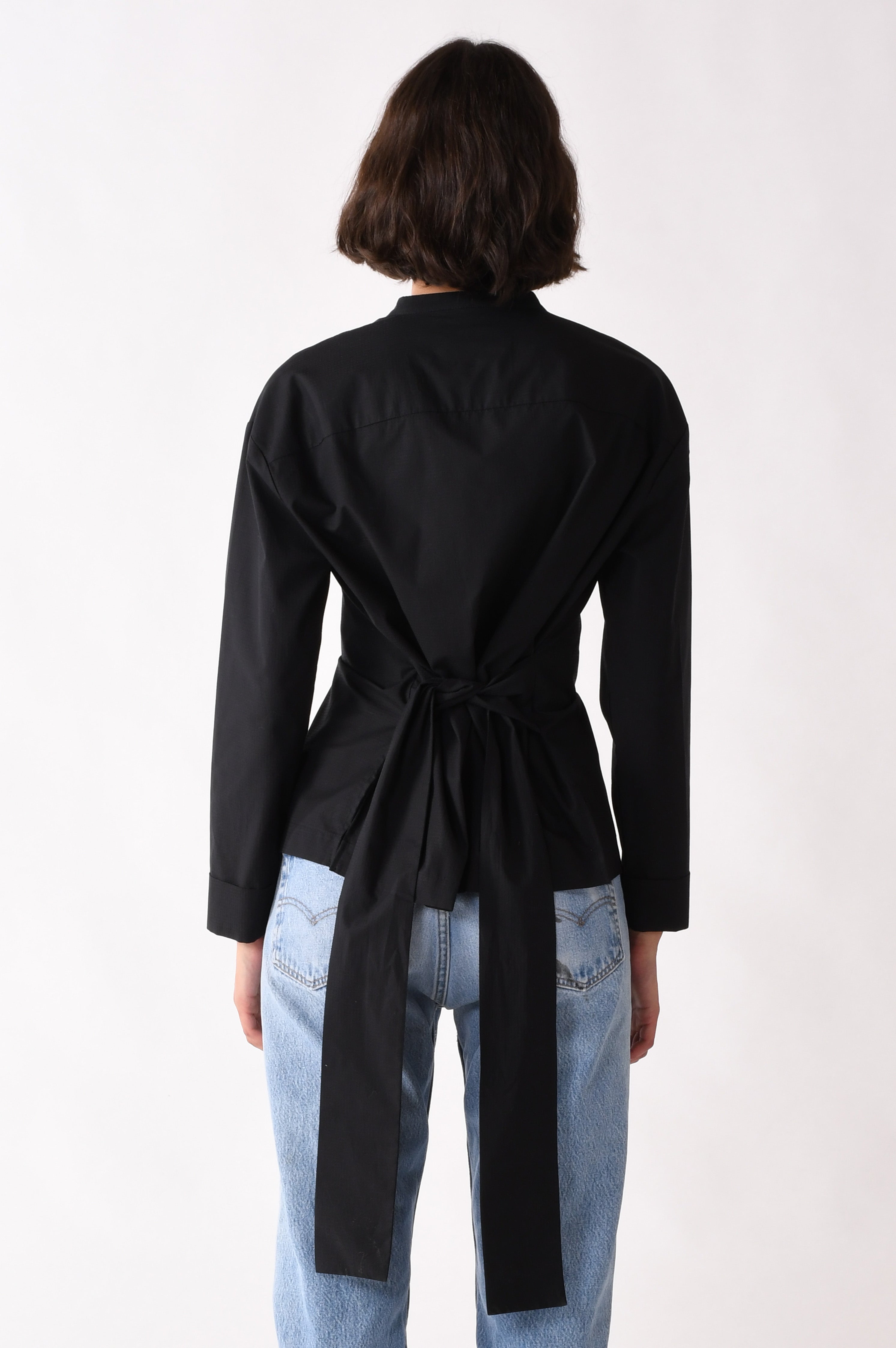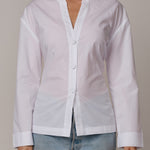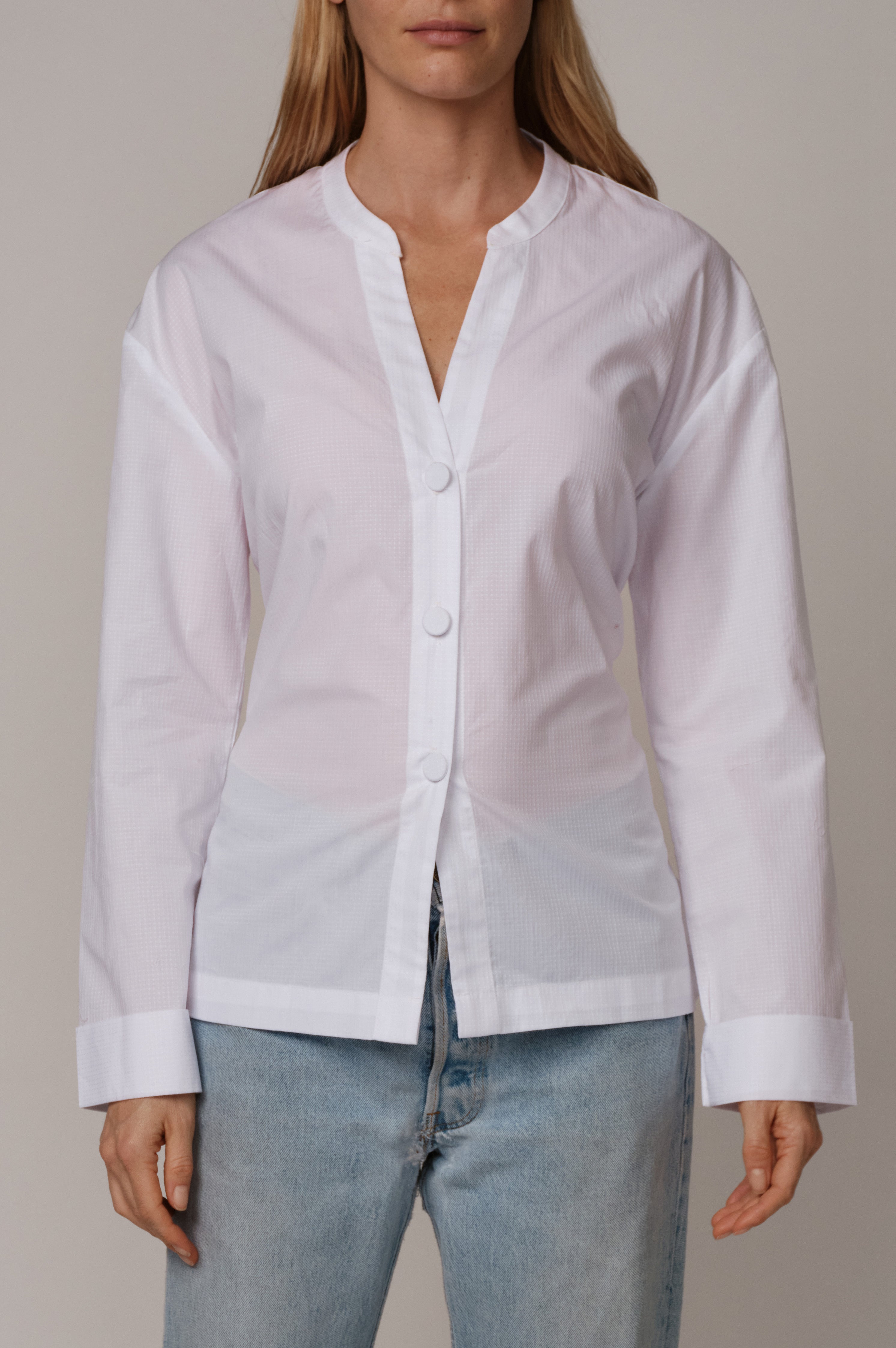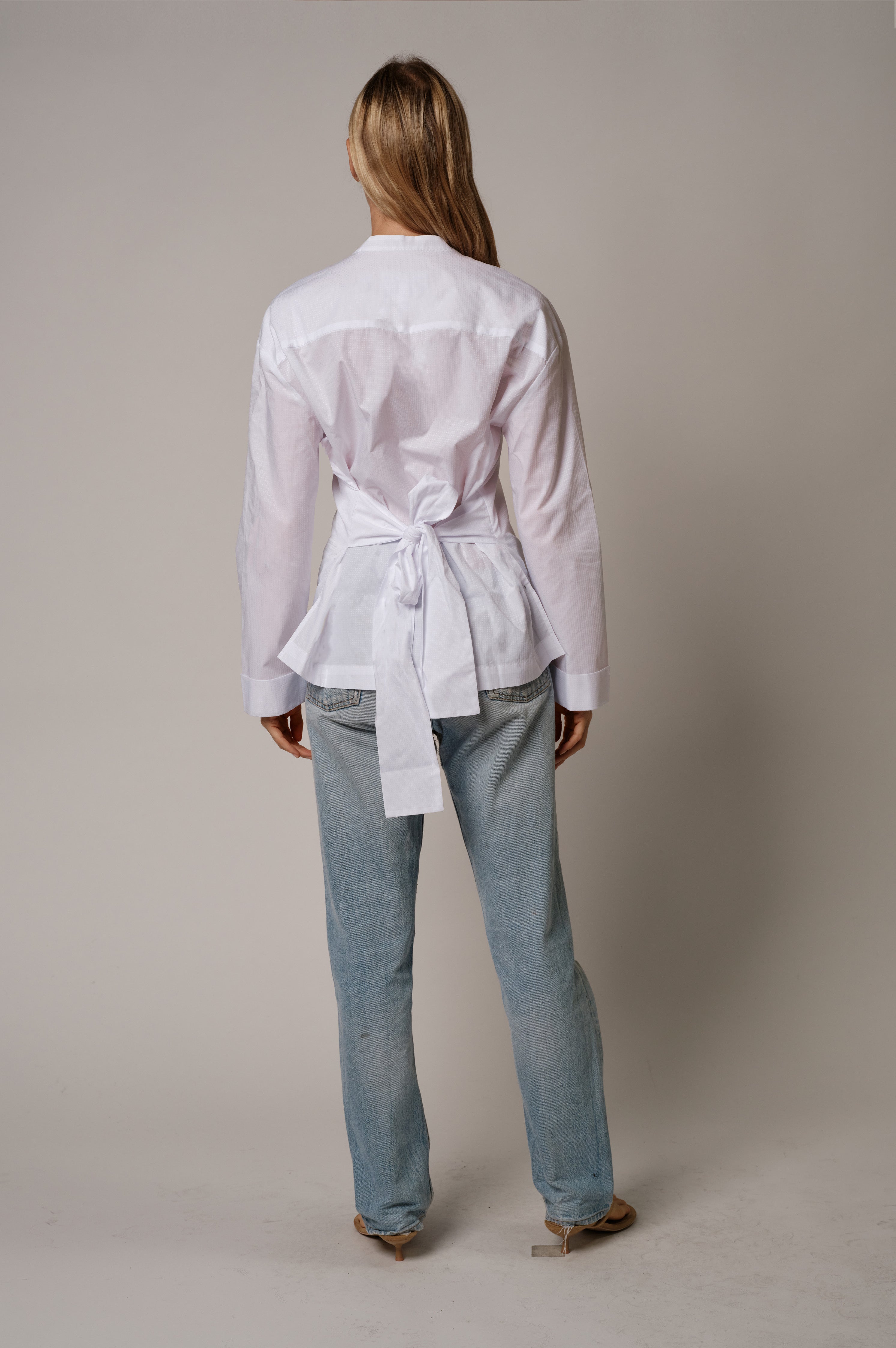 A collarless shirt with a soft face framing neckline. The bright white dobby fabric adds gentle texture. The A frame body opens lightly at the hem. The back bow lets you shape the waist as tight or as loose as you like.