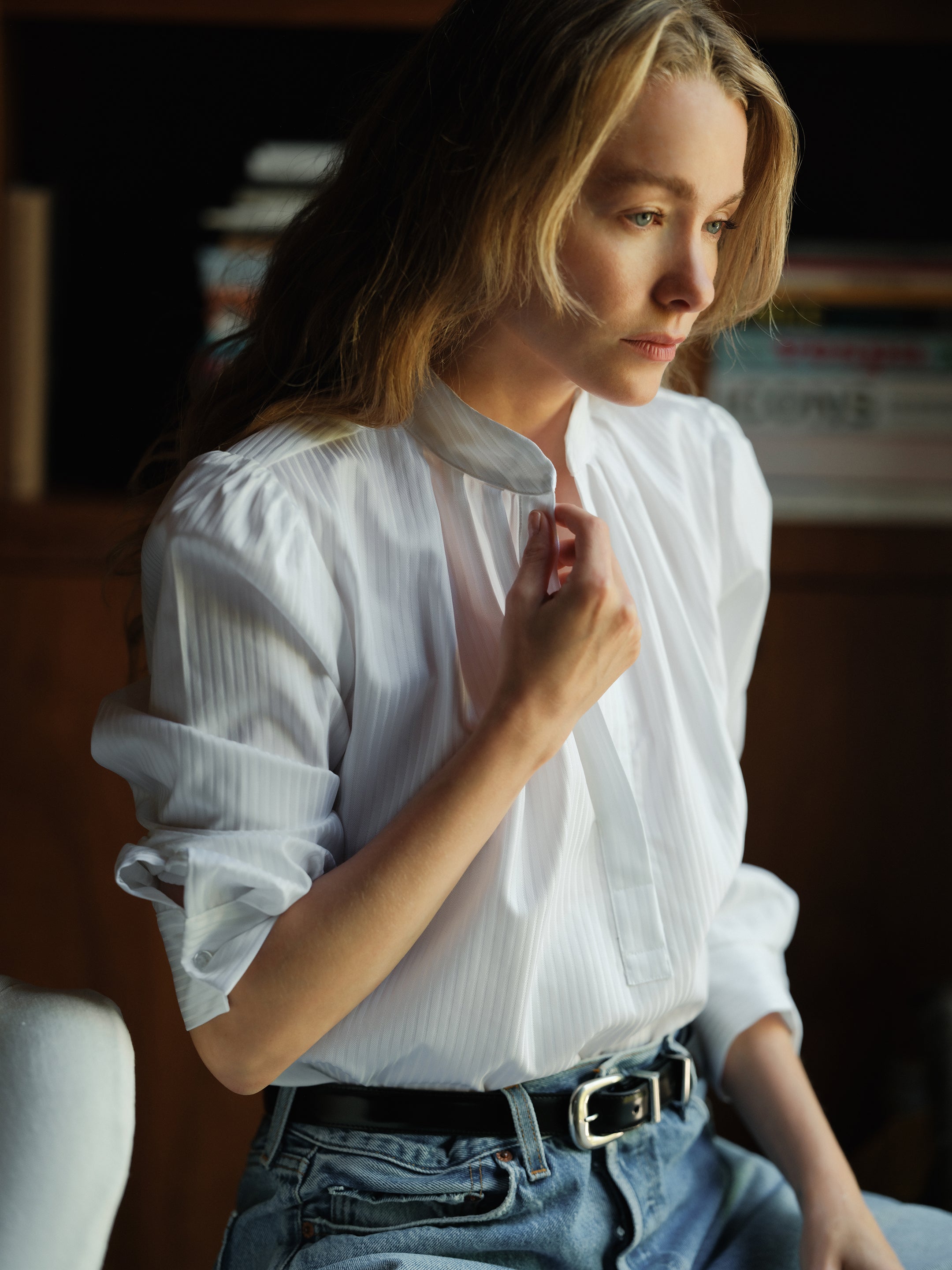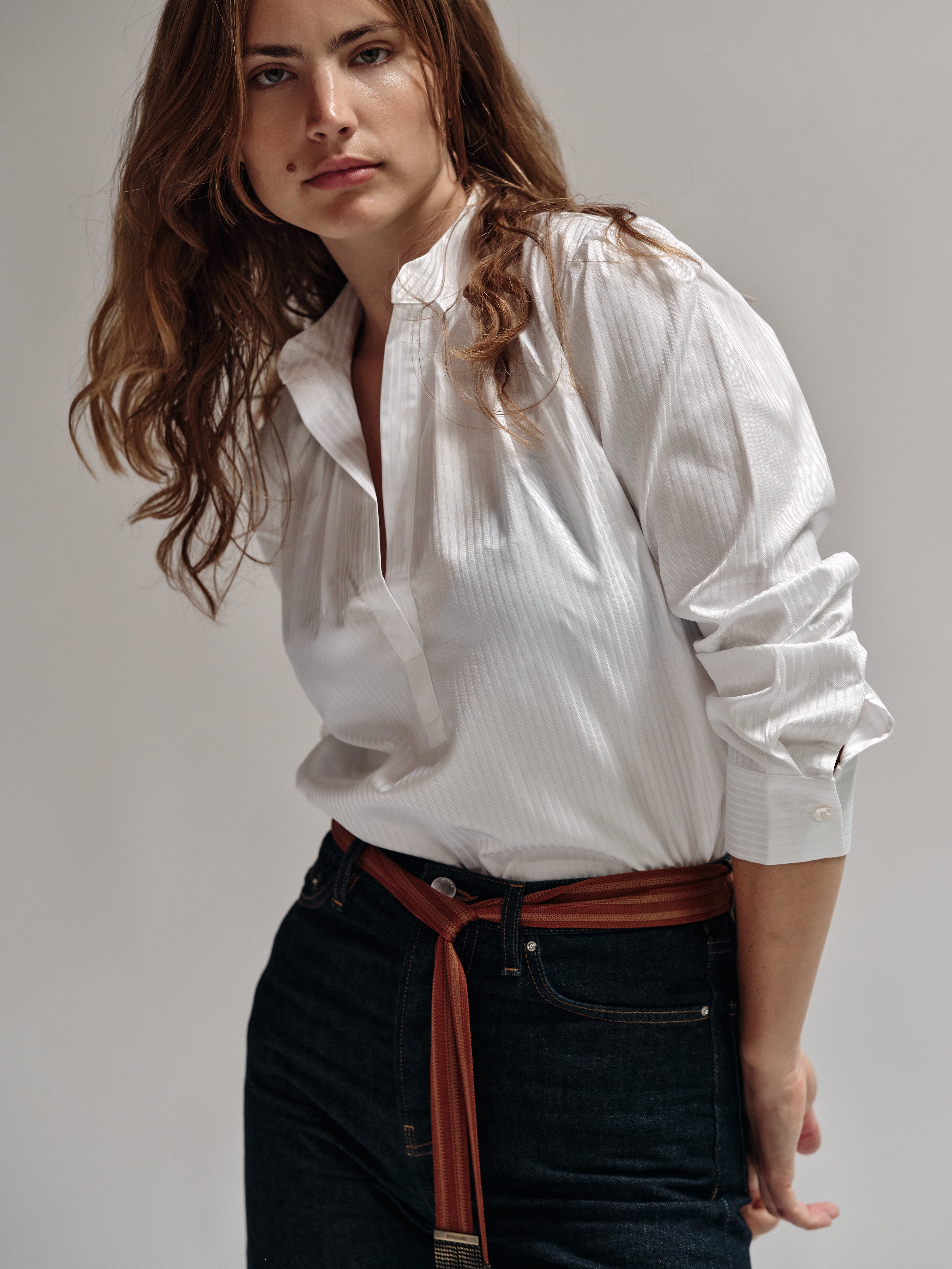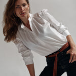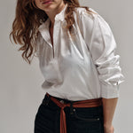 The PUFF is a pullover blouse with accentuated shoulders for a romantic and feminine look.  Details include a half front placket with a collar stand that lightly frames the face, and  elegant front shirring.  ¾ length Button cuffs sleeves  can be pushed up the arm to accentuate the puff, rolled up for a more casual feel or worn long to create a traditional look.  Our most popular non-wrapping shirt!