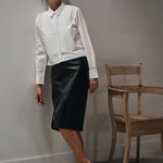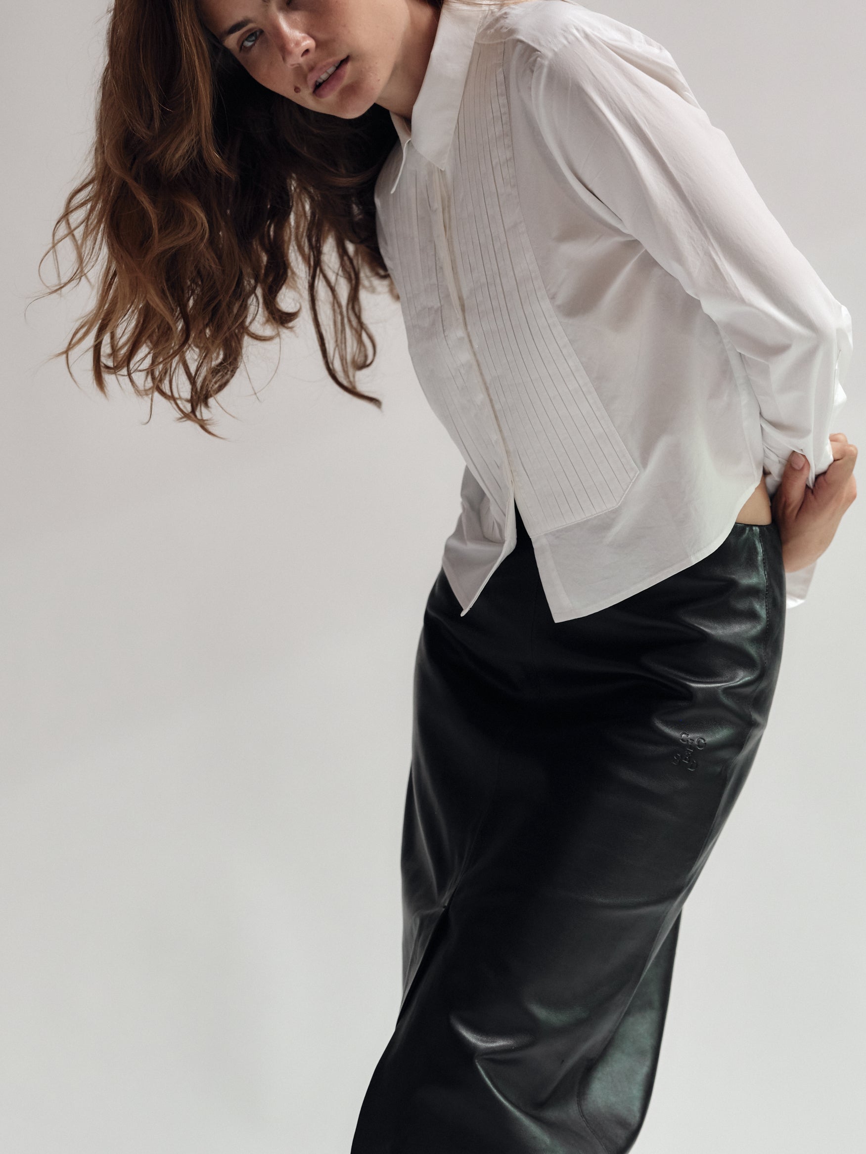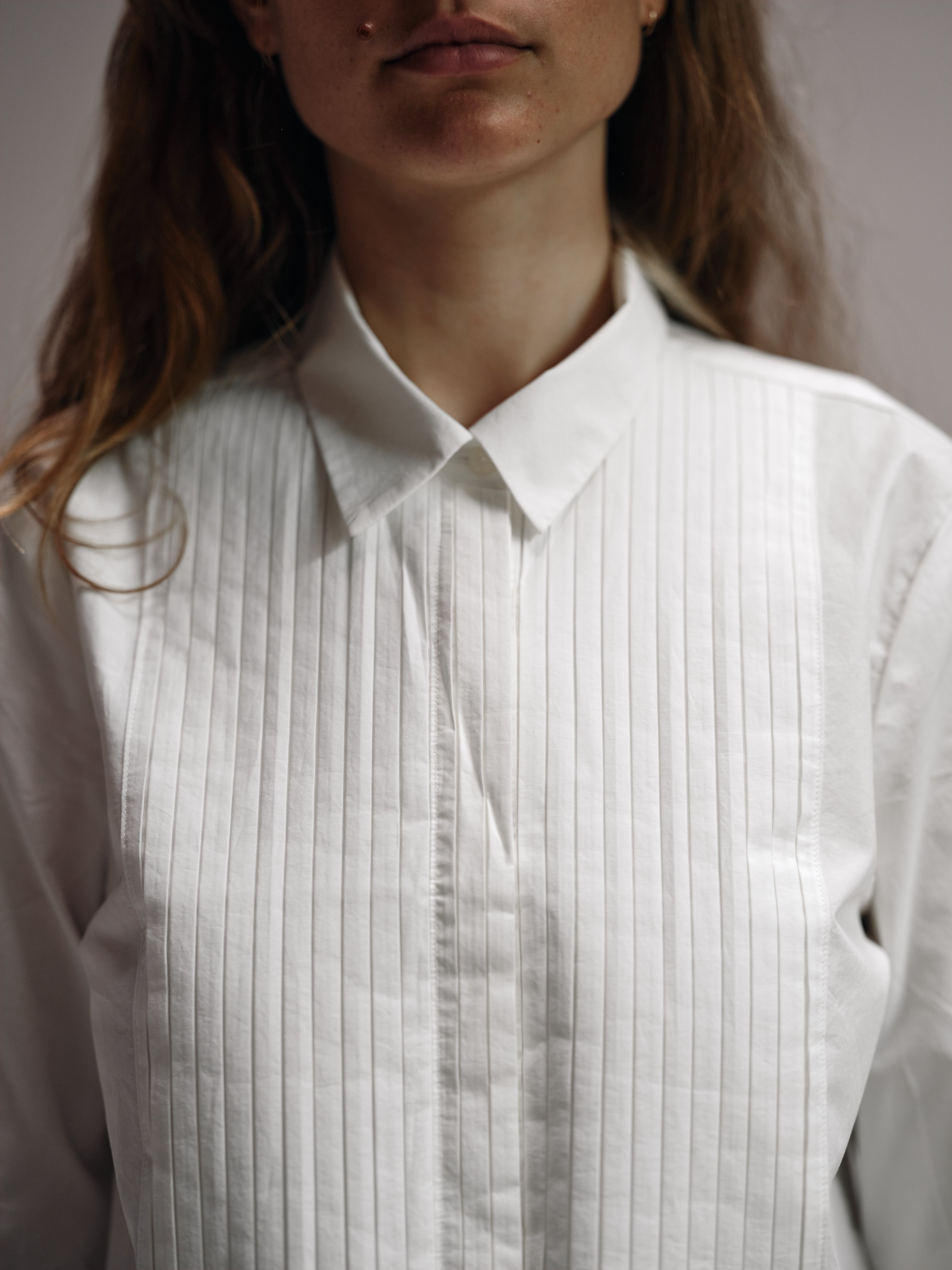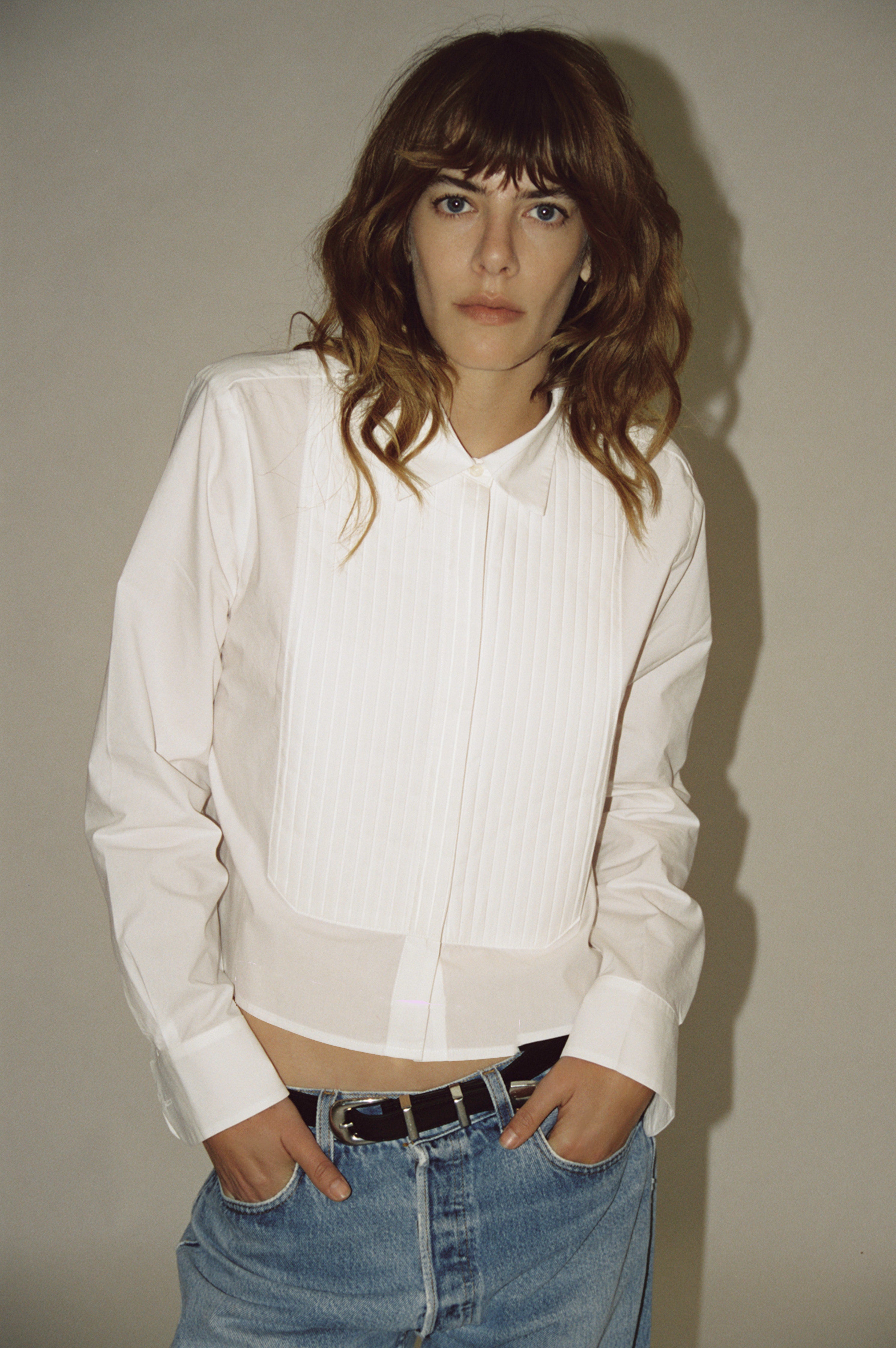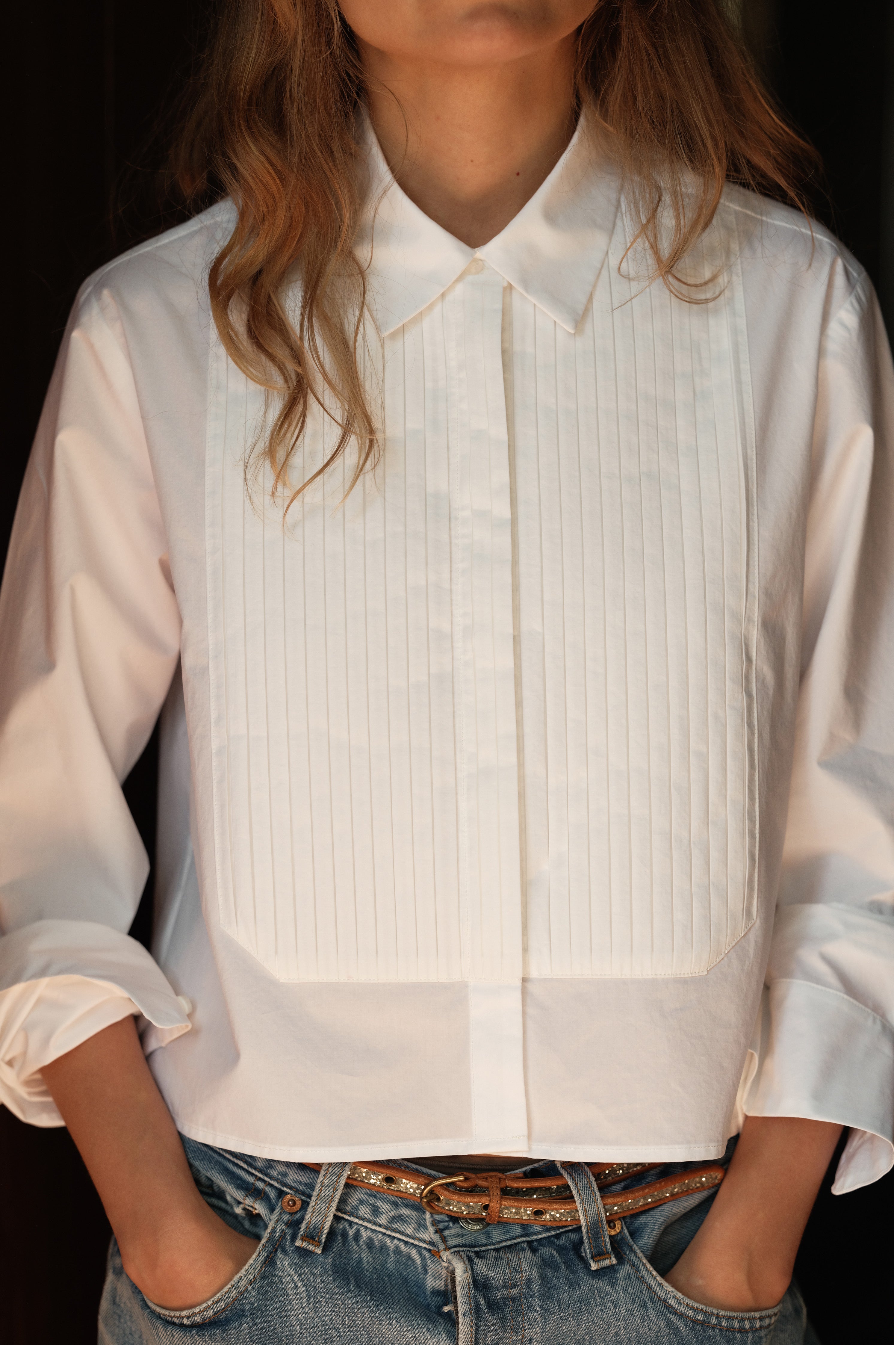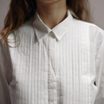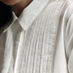A slightly cropped version of a classic Tuxedo shirt ,complete with handmade pleated tuxedo bib detail.