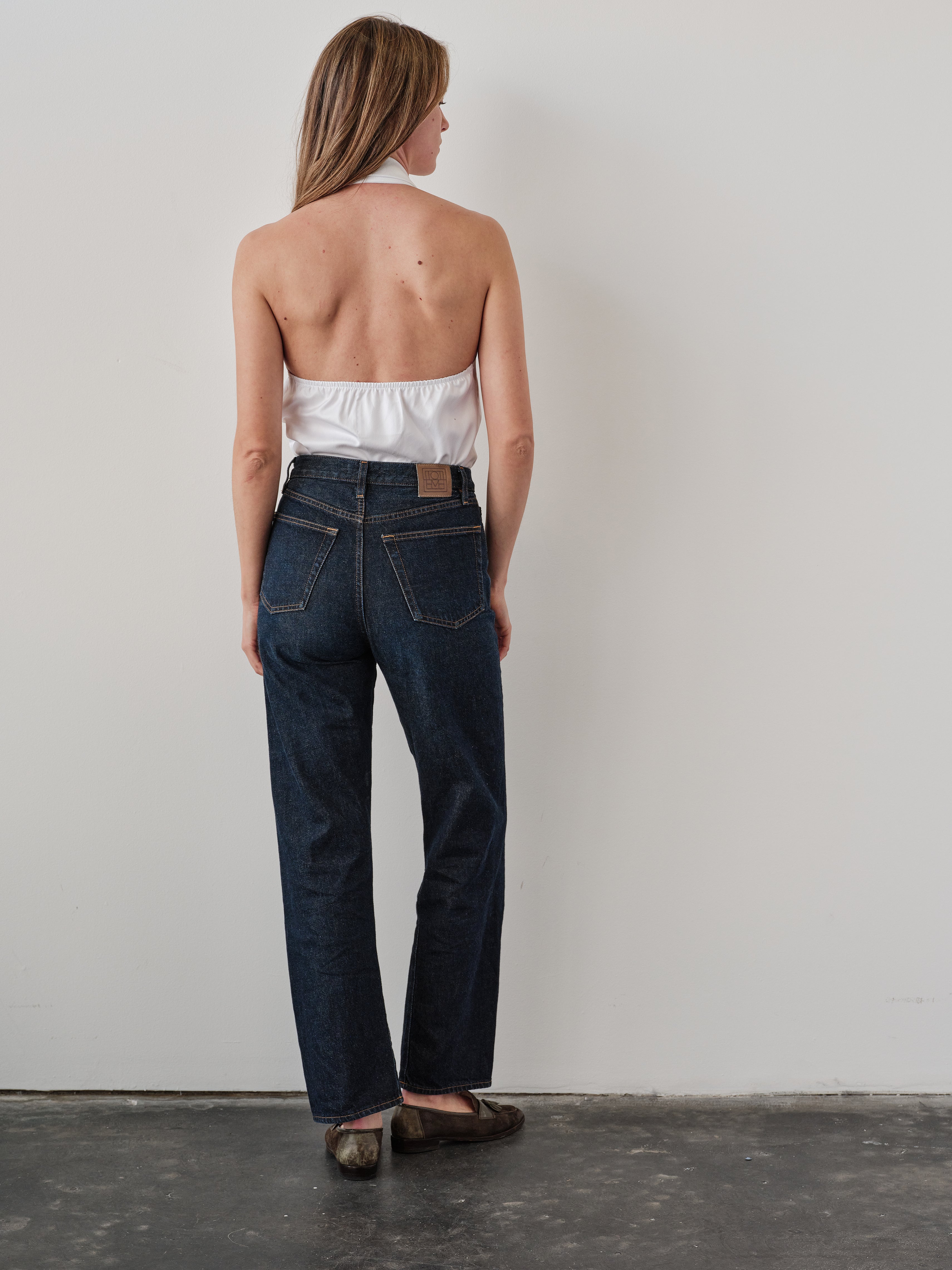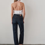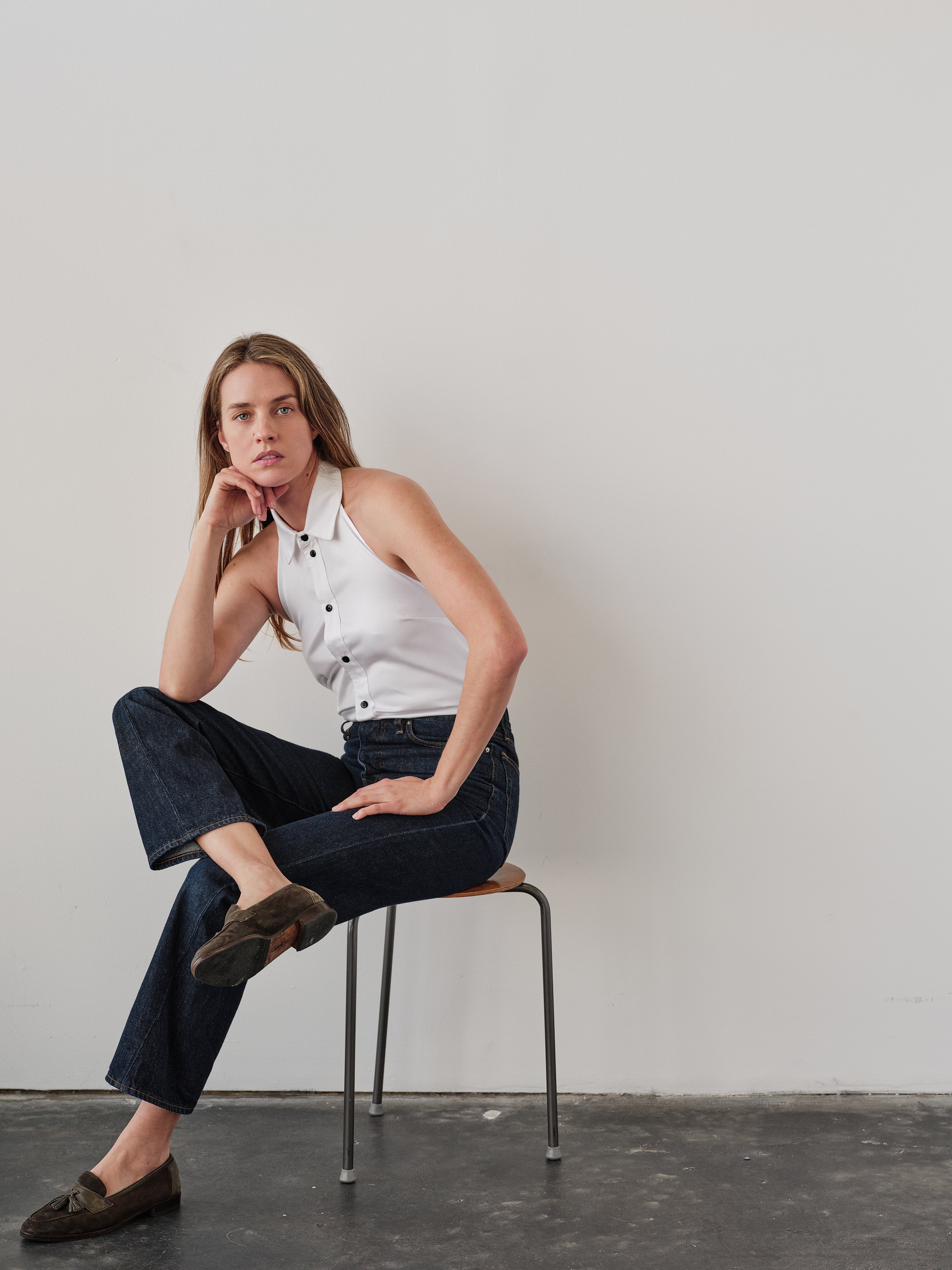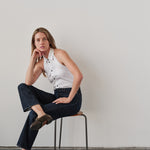 The button front VEST shirt. A clean silhouette with a deep open back. Finished with contrast and decorative buttons.