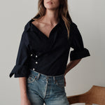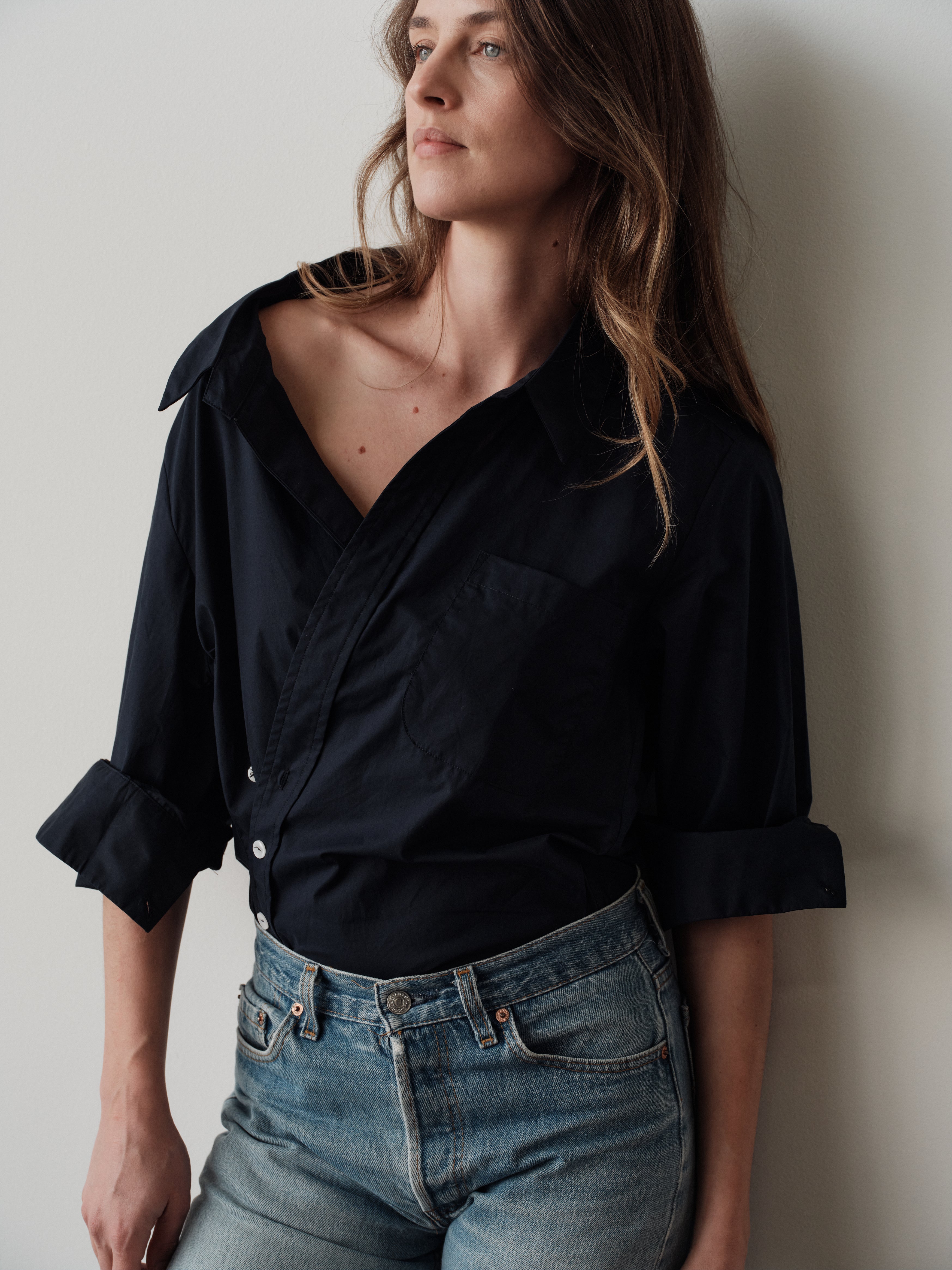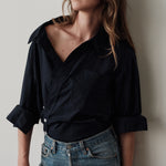 The Overshirt features a fixed wrap front with an asymmetrical placket, designed with a wider neckline that frames the face and highlights jewelry or the décolletage. Made in Los Angeles.