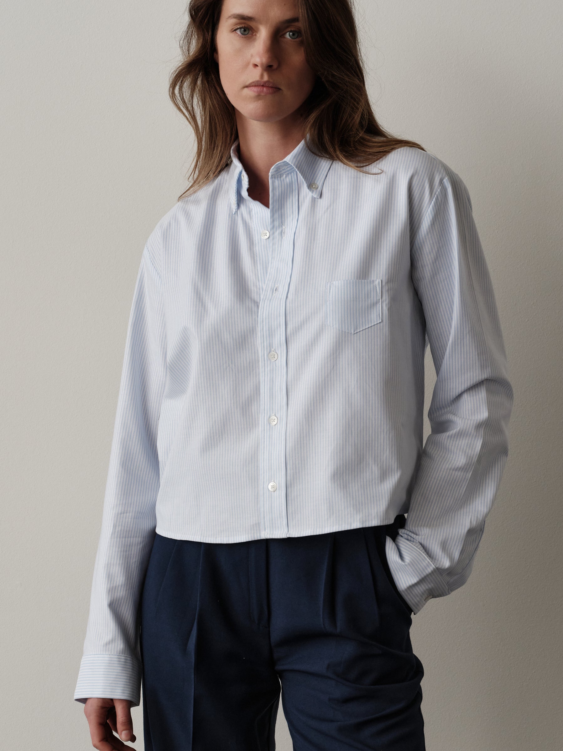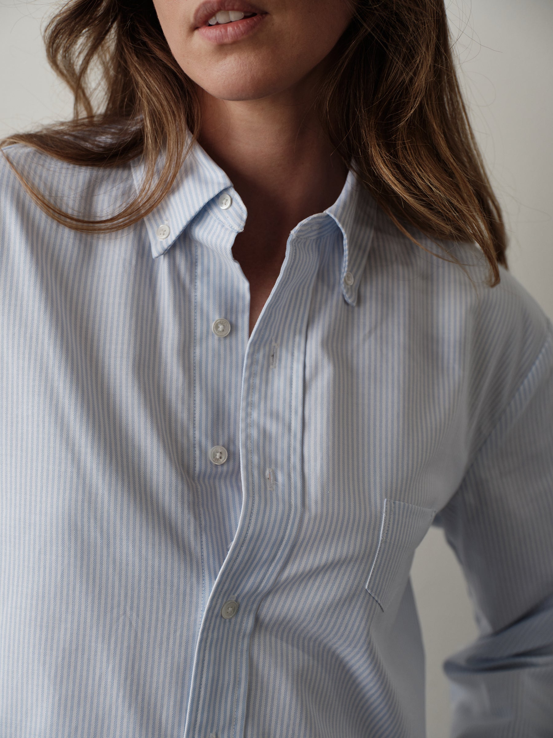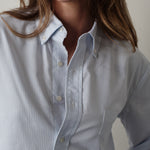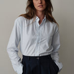 The COLLEGIATE is made in an Italian Oxford stripe from classic Albini cloth, woven from 100% extra long staple Egyptian cotton that gets better with each wash. It features a straight hemline and a traditional button down collar, designed to sit at the top of the jeans.