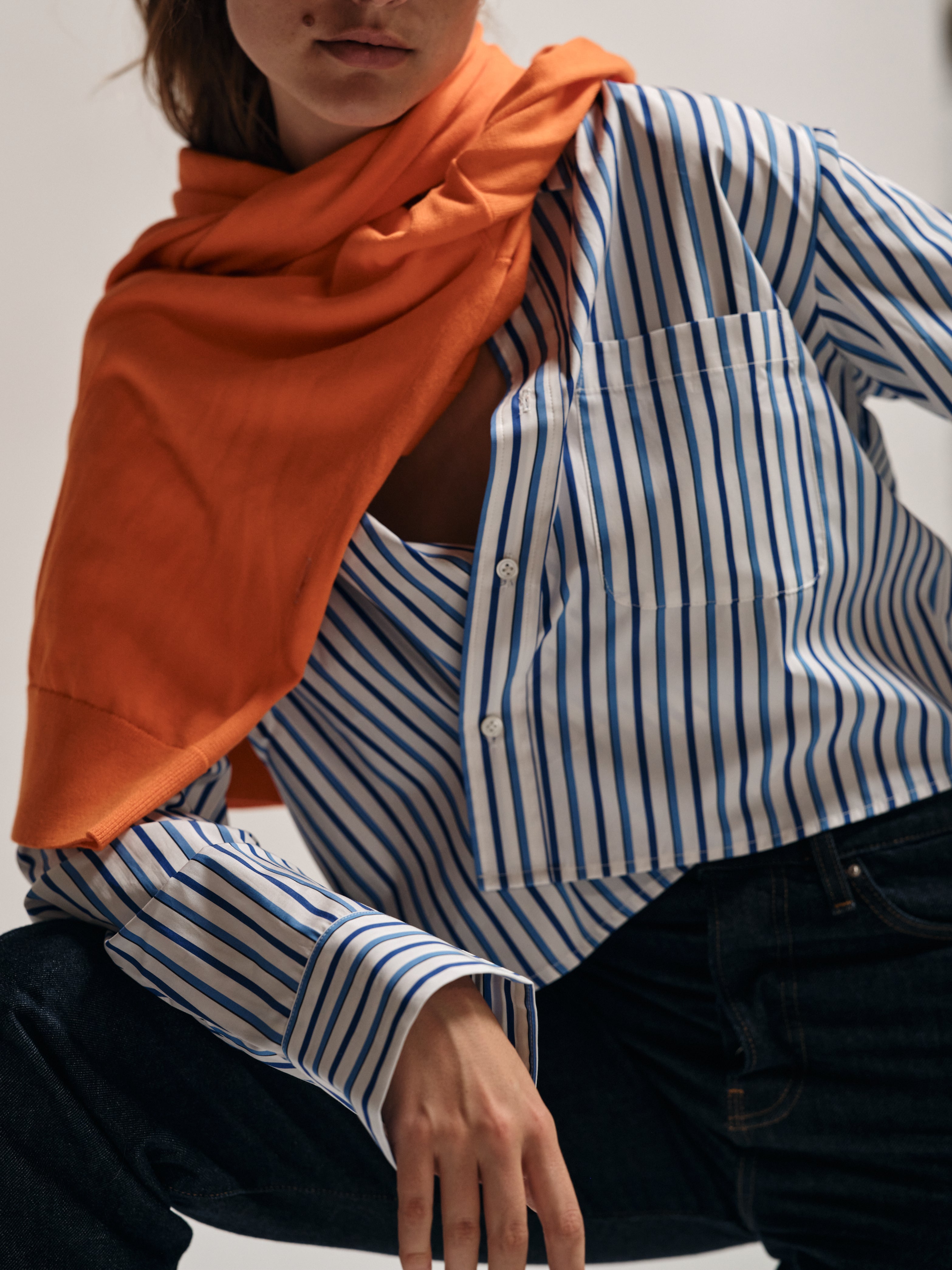 A wardrobe staple that can be worn regularly or wrapped. When wrapped it gently hugs the torso giving a flattering and form fitting look. Signature contrast pink buttons and buttonhole details serve as a wrapping template.