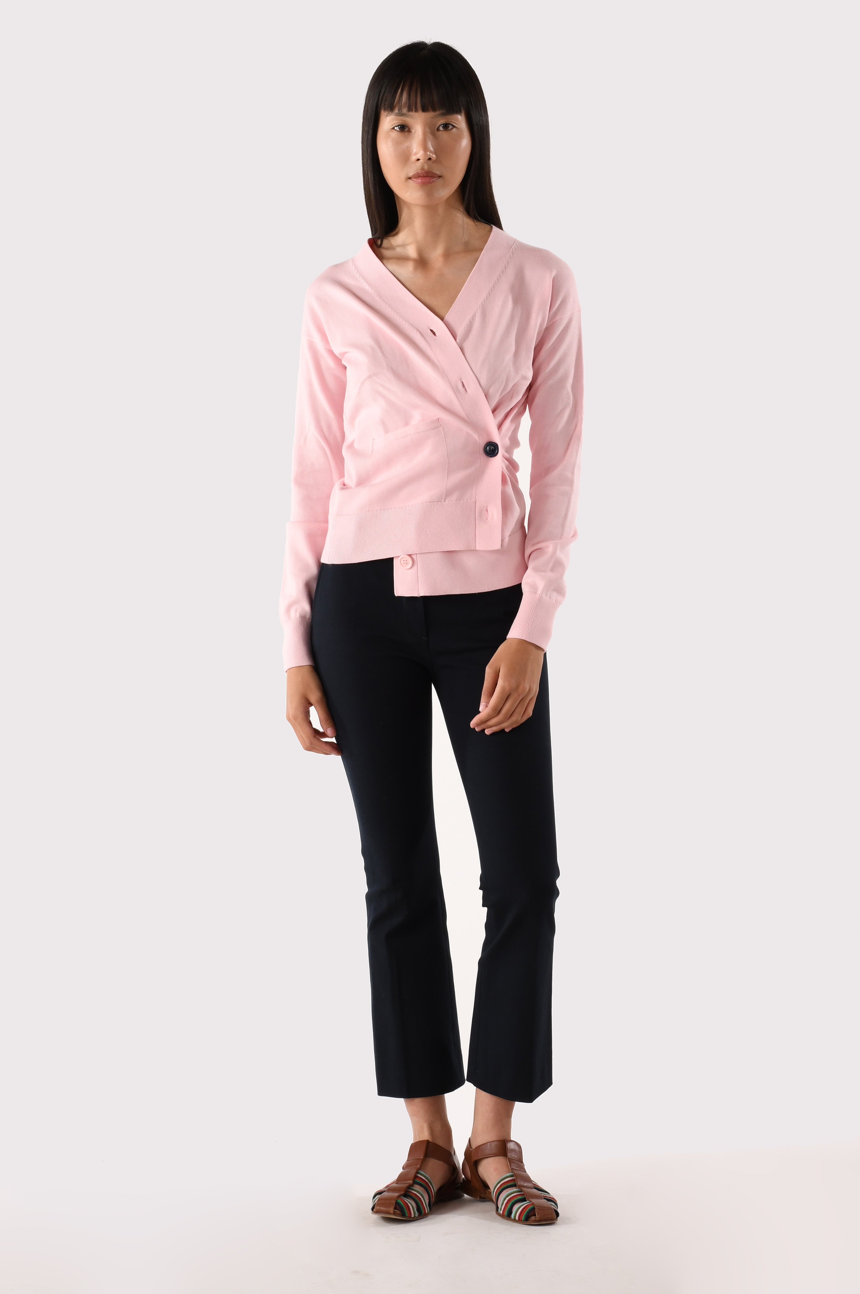 A wardrobe staple that can be worn regularly or wrapped. When wrapped it gently hugs the torso giving a flattering and form fitting look. Signature contrast pink buttons and buttonhole details serve as a wrapping template.