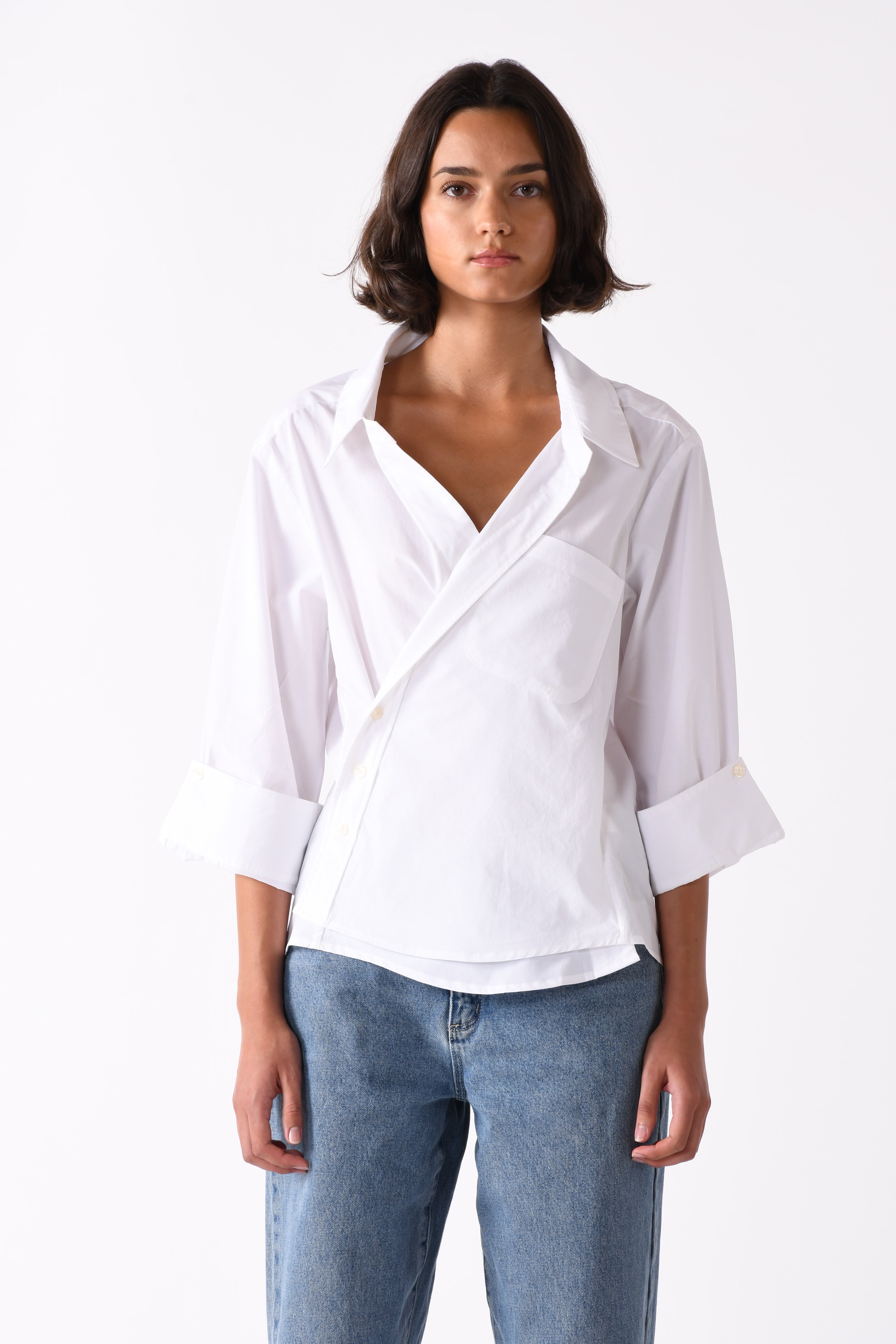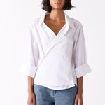 The Overshirt. Fixed wrap front with an asymmetrical front placket. Pullover style with a wider neckline for an effortless shape. Made in Los Angeles.