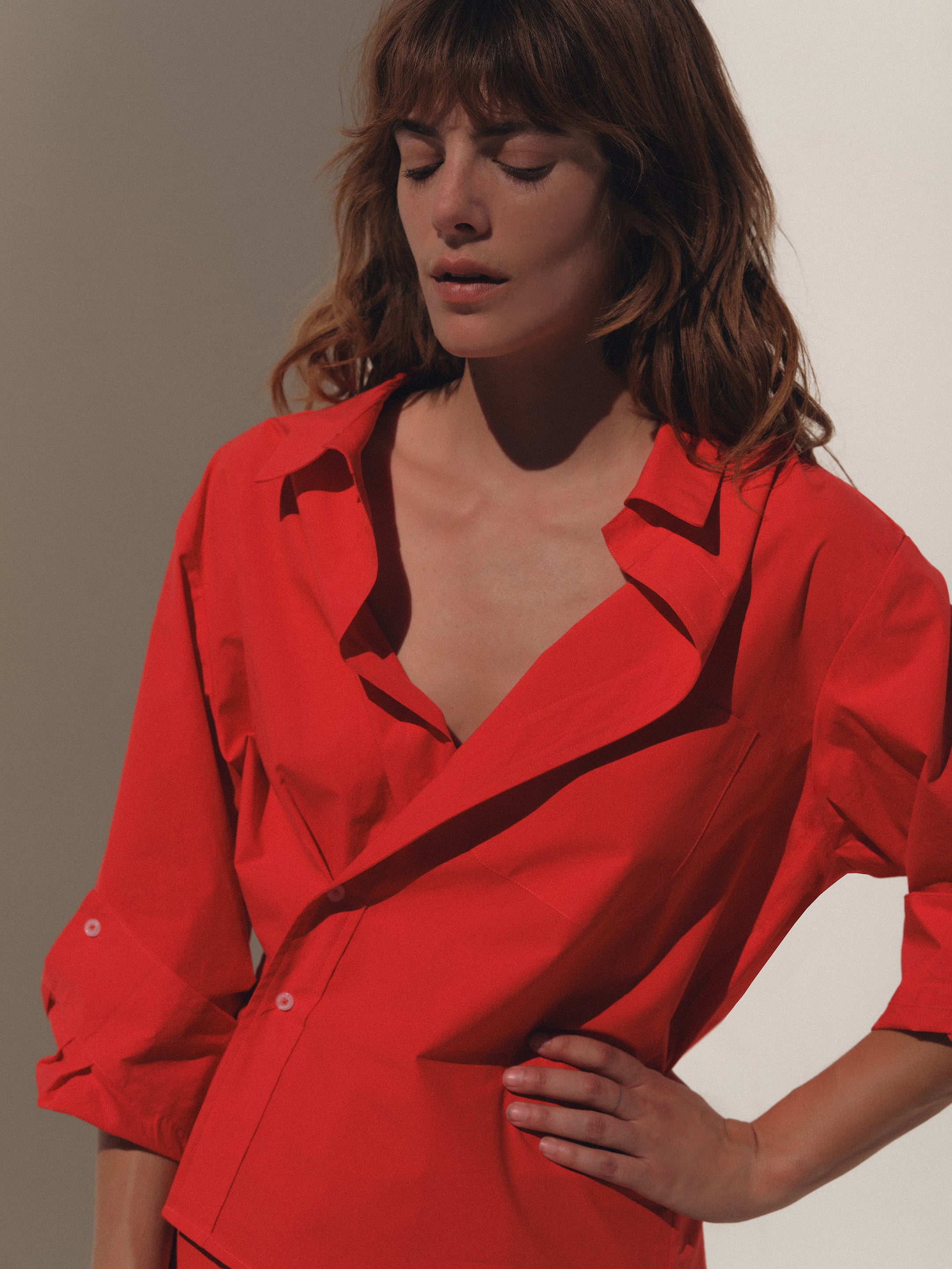 New to our wrap shirt repertoire. A pullover-style design with a wider neckline and a fixed wrapped look. Designed to give the appearance of an effortlessly fixed wrap.