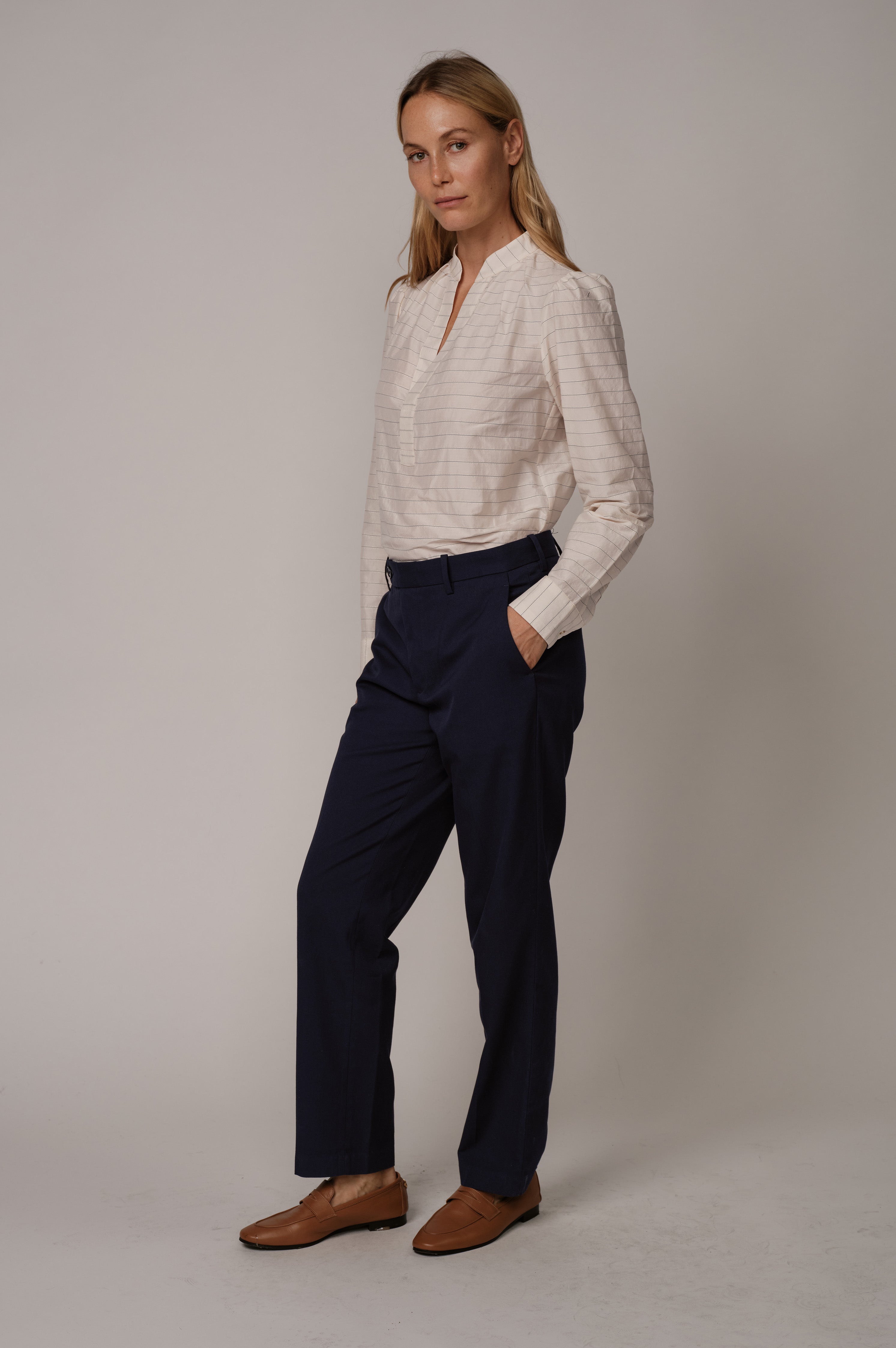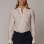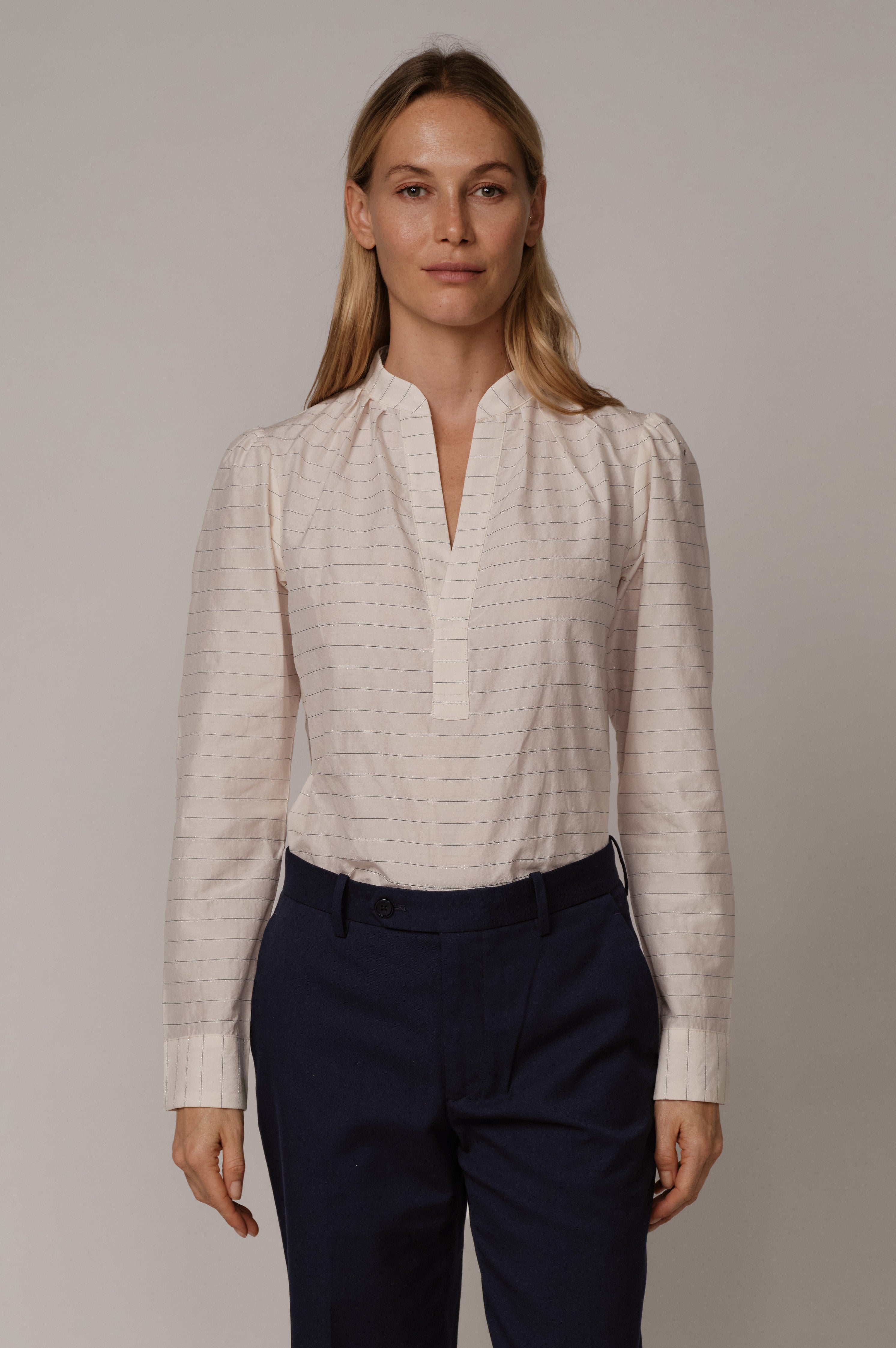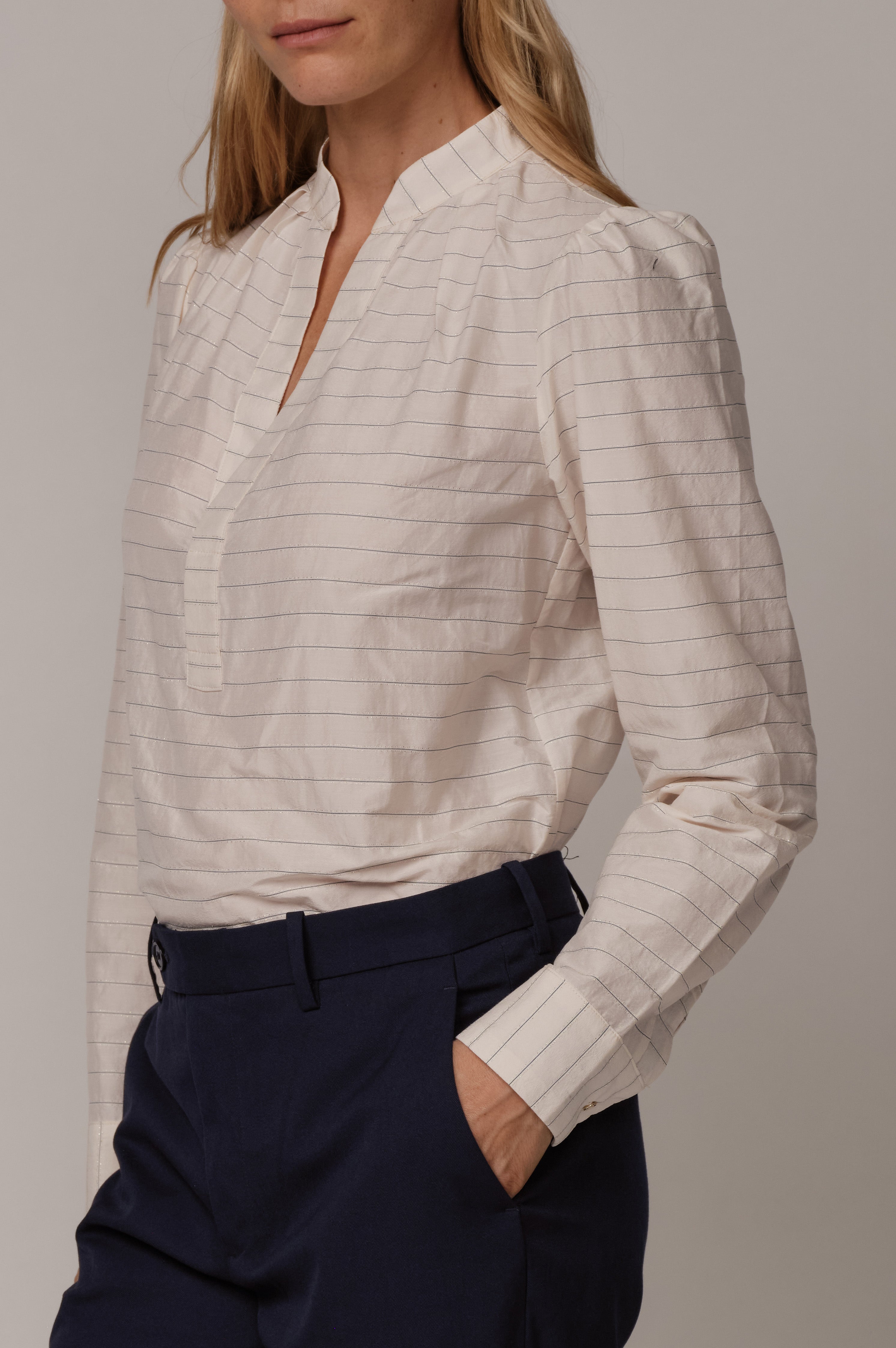 The PUFF is a pullover blouse with accentuated shoulders for a romantic and feminine look. Details include a half front placket with a collar stand that lightly frames the face, and elegant front shirring. ¾ length Button cuffs sleeves can be pushed up the arm to accentuate the puff, rolled up for a more casual feel or worn long to create a traditional look. Our most popular non-wrapping shirt!
