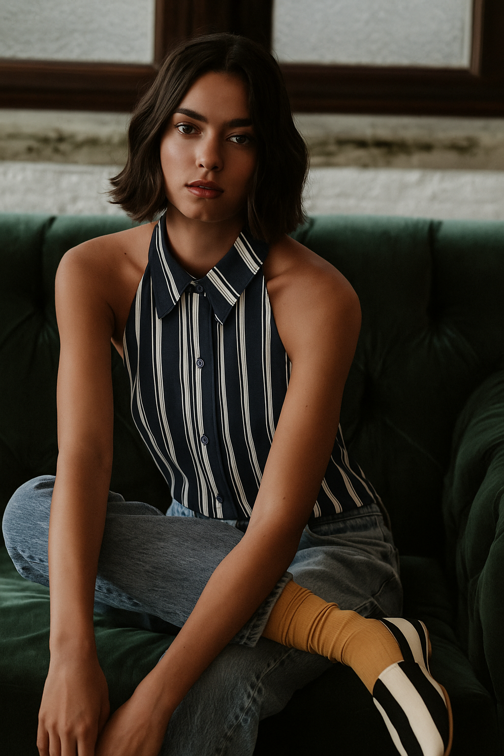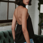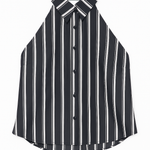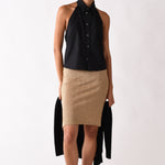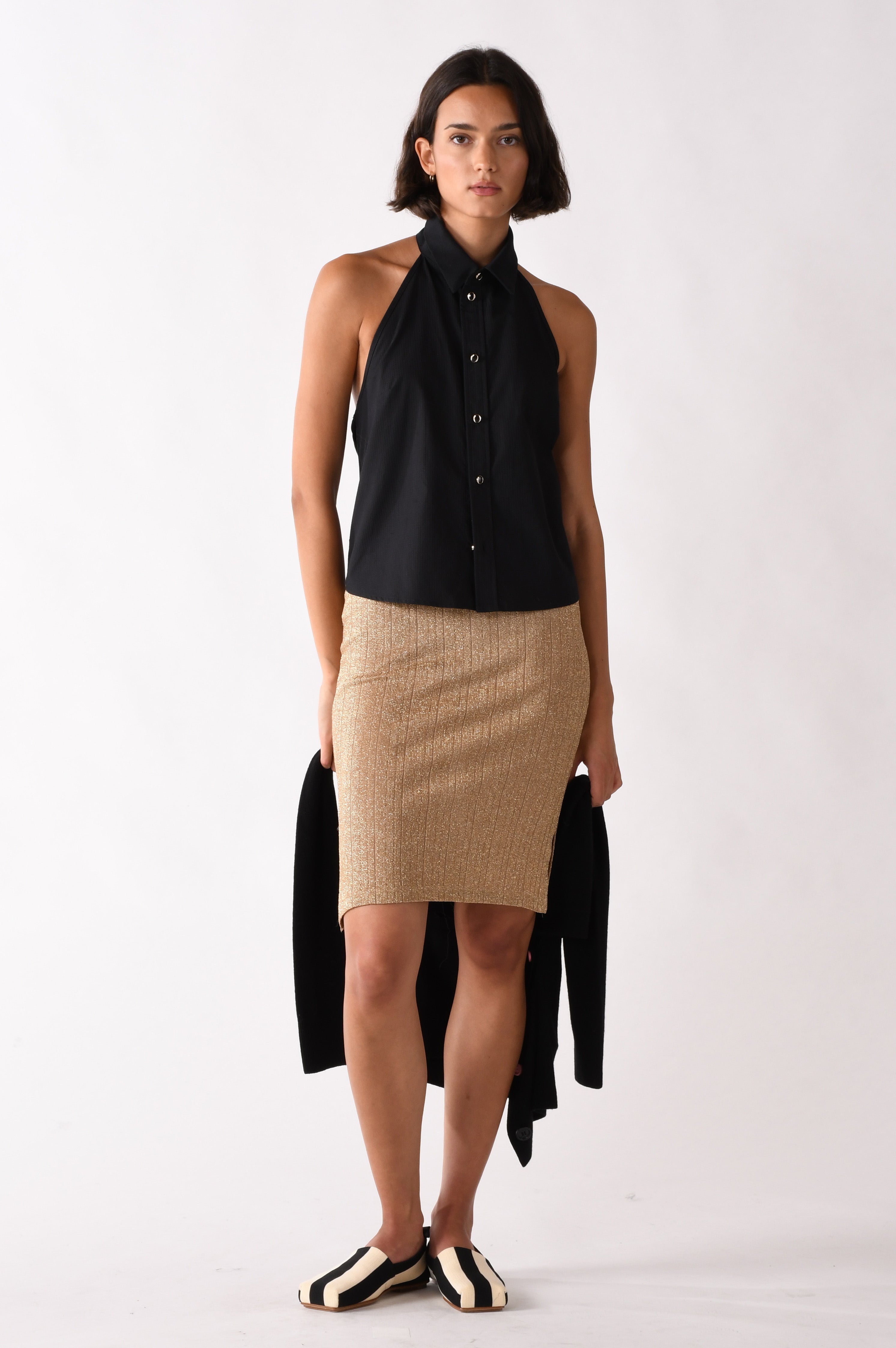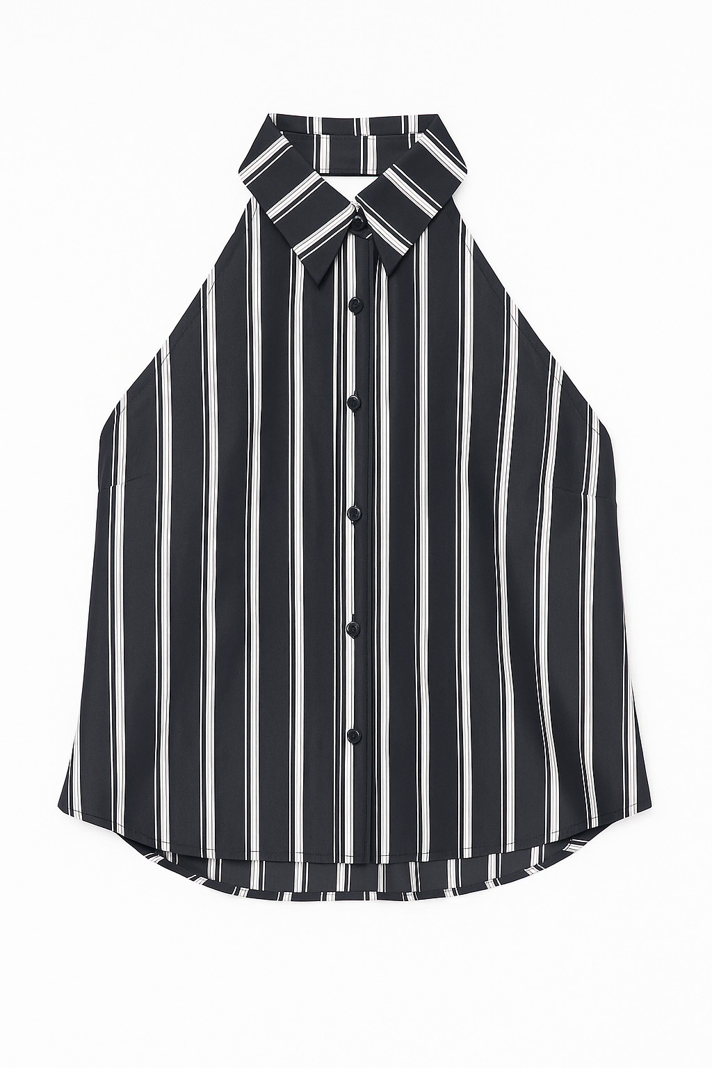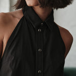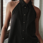 The low-back halter shirt. A clean silhouette with a deep open back. Finished with black buttons for subtle contrast.