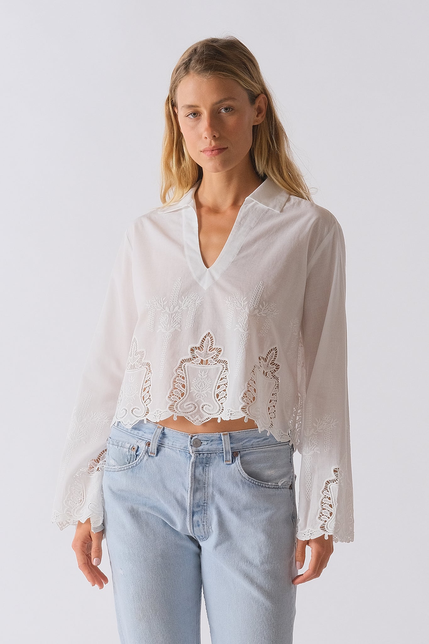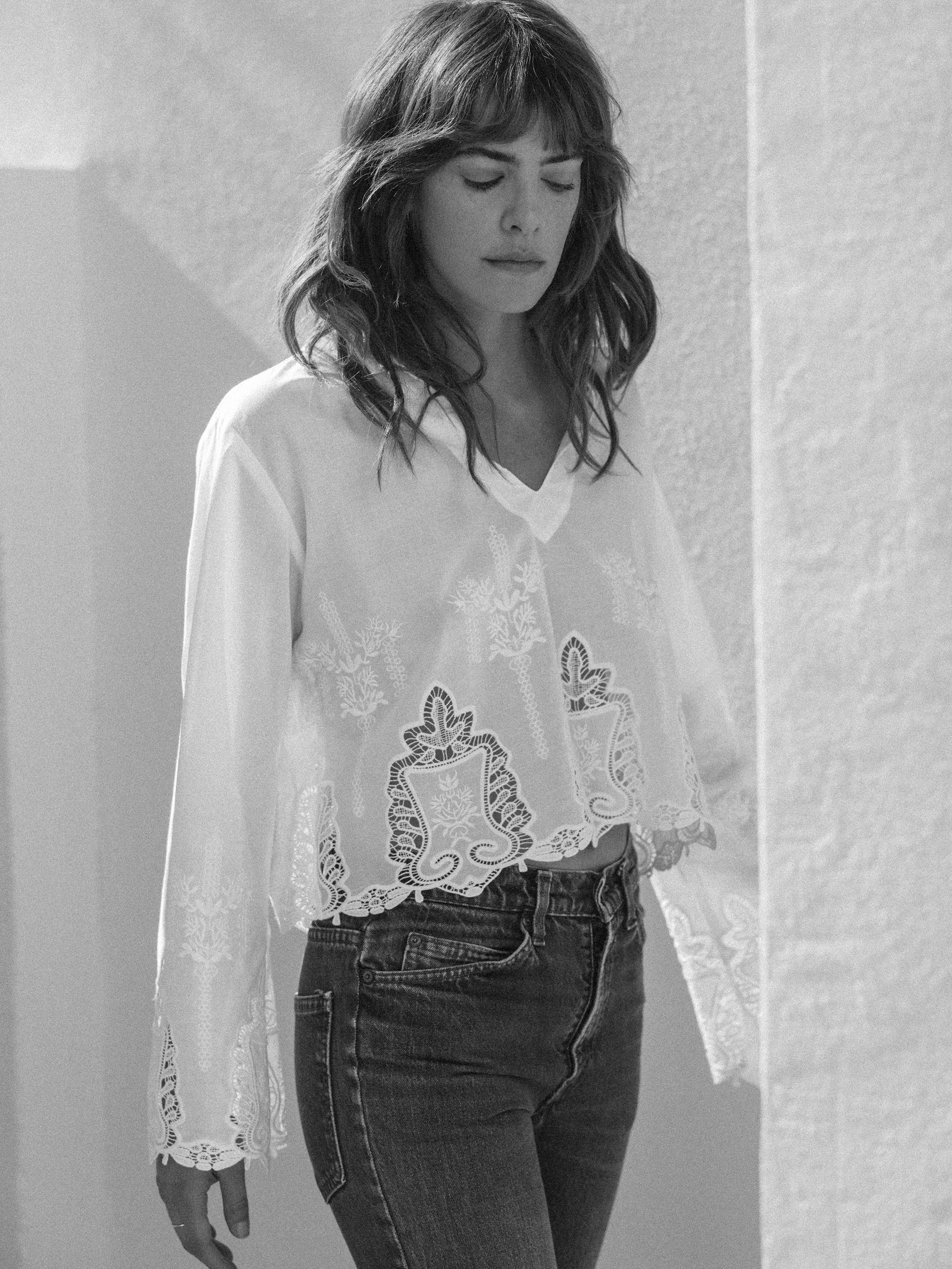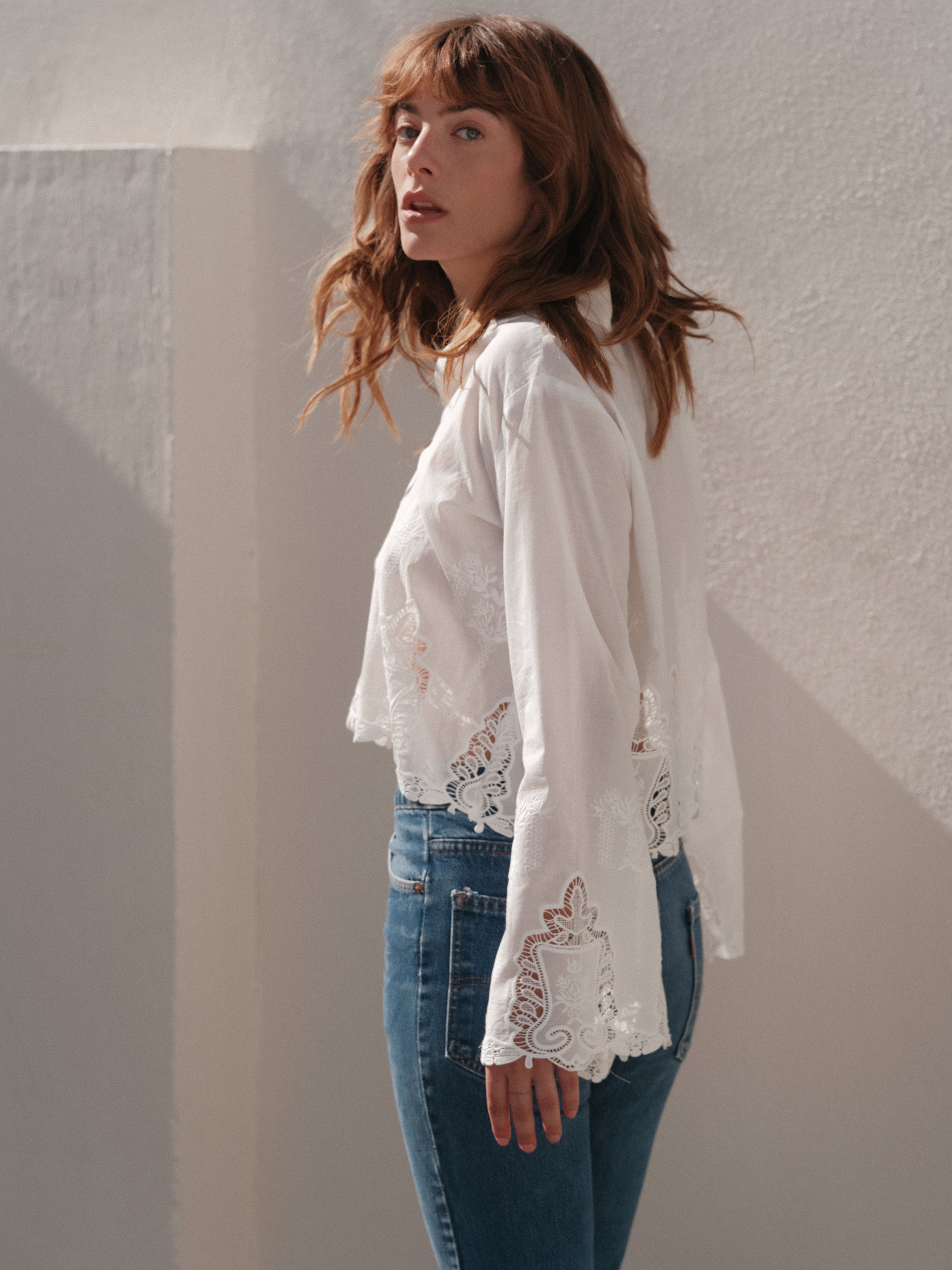 Delicate and refined, the VICTORIAN in white is crafted from 100% cotton lace, offering a breathable, soft hand feel. Intricate scalloped edges trace the hem and sleeves, lending a romantic finish to its clean silhouette.